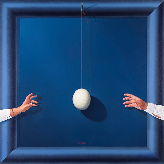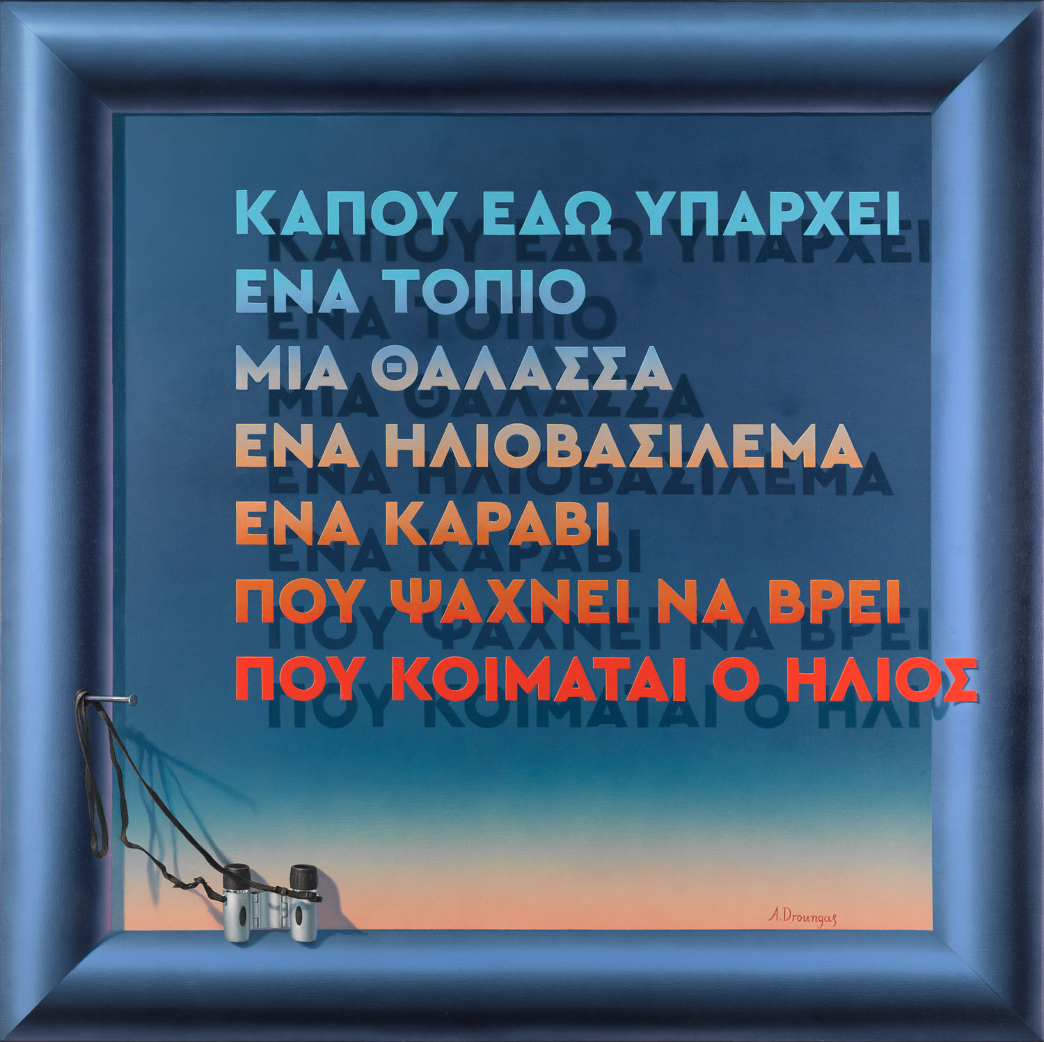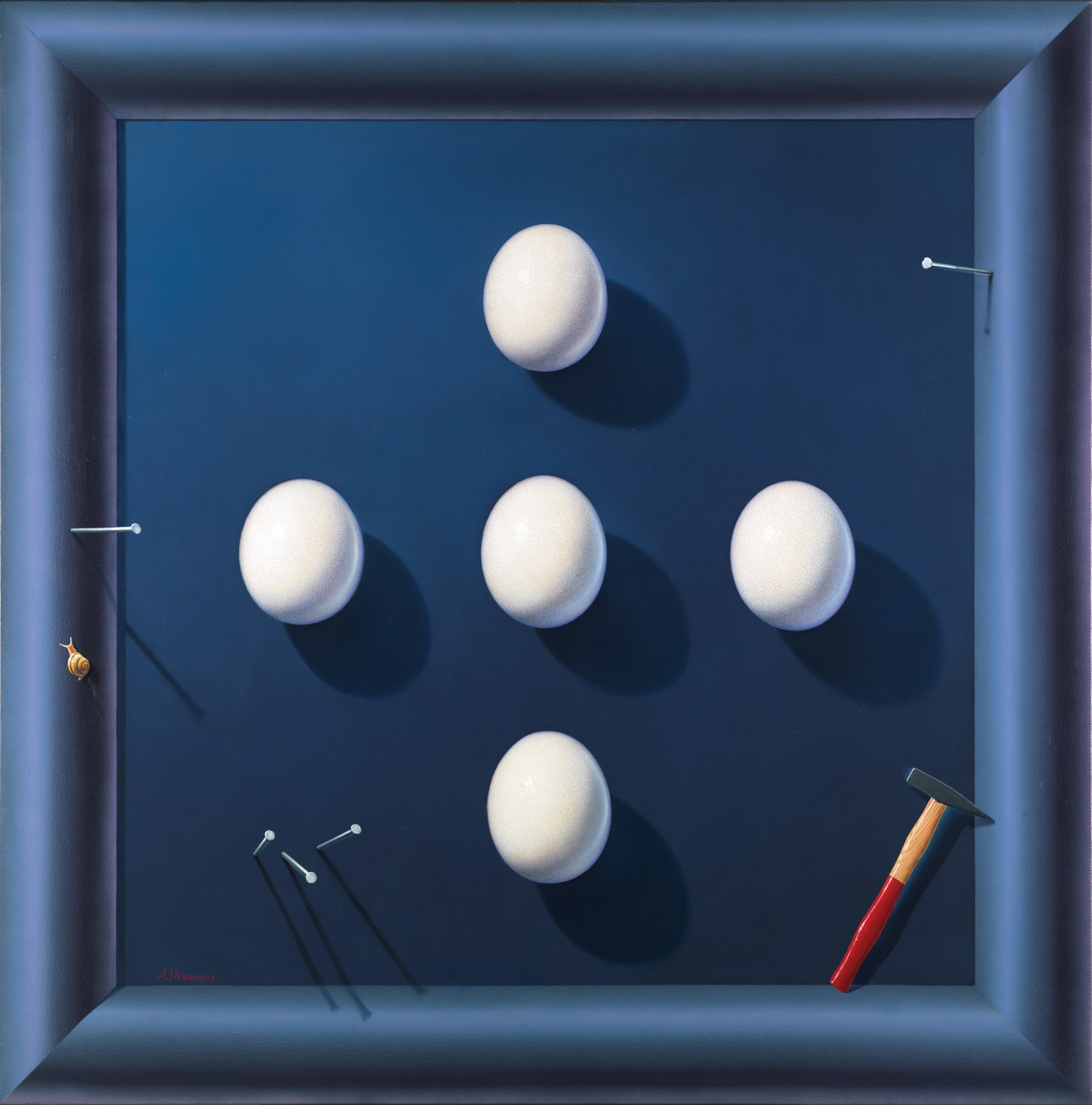 «Η έννοια "concept", είναι ο κύριος στόχος του πίνακα» λέει ο Αχιλλέας Δρούγκας. «Η χρωματική αρμονία, η σύνθεση, η "ζωγραφικότητα" δεν είναι ο κύριος σκοπός αυτής της δουλειάς. Η τεχνική της οφθαλμαπάτης επιτείνεται από μια ζωγραφισμένη κορνίζα που δημιουργεί την ψευδαίσθηση της αληθινής και έτσι δημιουργείται ένας καθορισμένος χώρος για να αναπτυχθεί η ιδέα. Το τελικό αποτέλεσμα μοιάζει περισσότερο με τρισδιάστατη κατασκευή.