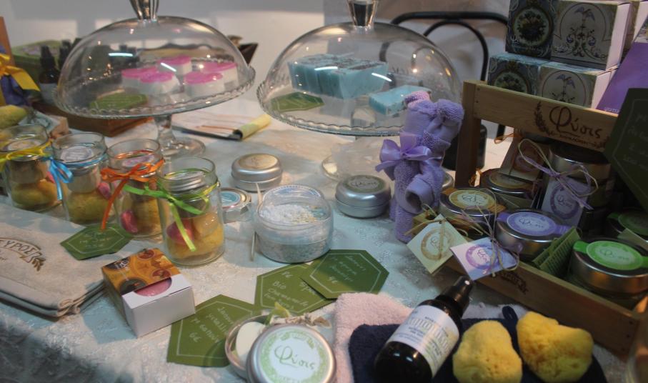 Το κοινό έχει την ευκαιρία να βρει καλόγουστα σουβενίρ, δια χειρός Μαριάννας Βακονδίου, στα οποία κυριαρχούν η Άνω Σύρος με το μπουζούκι και τον πατριάρχη του ρεμπέτικου Μάρκο Βαμβακάρη και το μπλε του Αιγαίου. Περίοπτη θέση κατέχουν τα φυτικά και φυσικά καλλυντικά της Αργυρένιας Παραμάνη «Φύσις», στα οποία περιλαμβάνονται και οι «καρποί» νέων συνεργασιών. Μεταξύ αυτών, ένα χαμομηλόλαδο για πρόσωπο, σώμα και μαλλιά το οποίο παρασκευάζεται από βιολογικό χαμομήλι που καλλιεργεί η Φραγκίσκα Βουτσίνου στον Γαλλησά. «Πρόκειται για ένα φυτικό προϊόν, χωρίς συντηρητικά, χημικά, χρώματα και αρώματα» σημειώνει, η δημιουργός. Το ίδιο χαμομήλι υπάρχει και σε ένα feet spa, βασικές ύλες του οποίου είναι ο ανθός του και το θαλασσινό αλάτι.