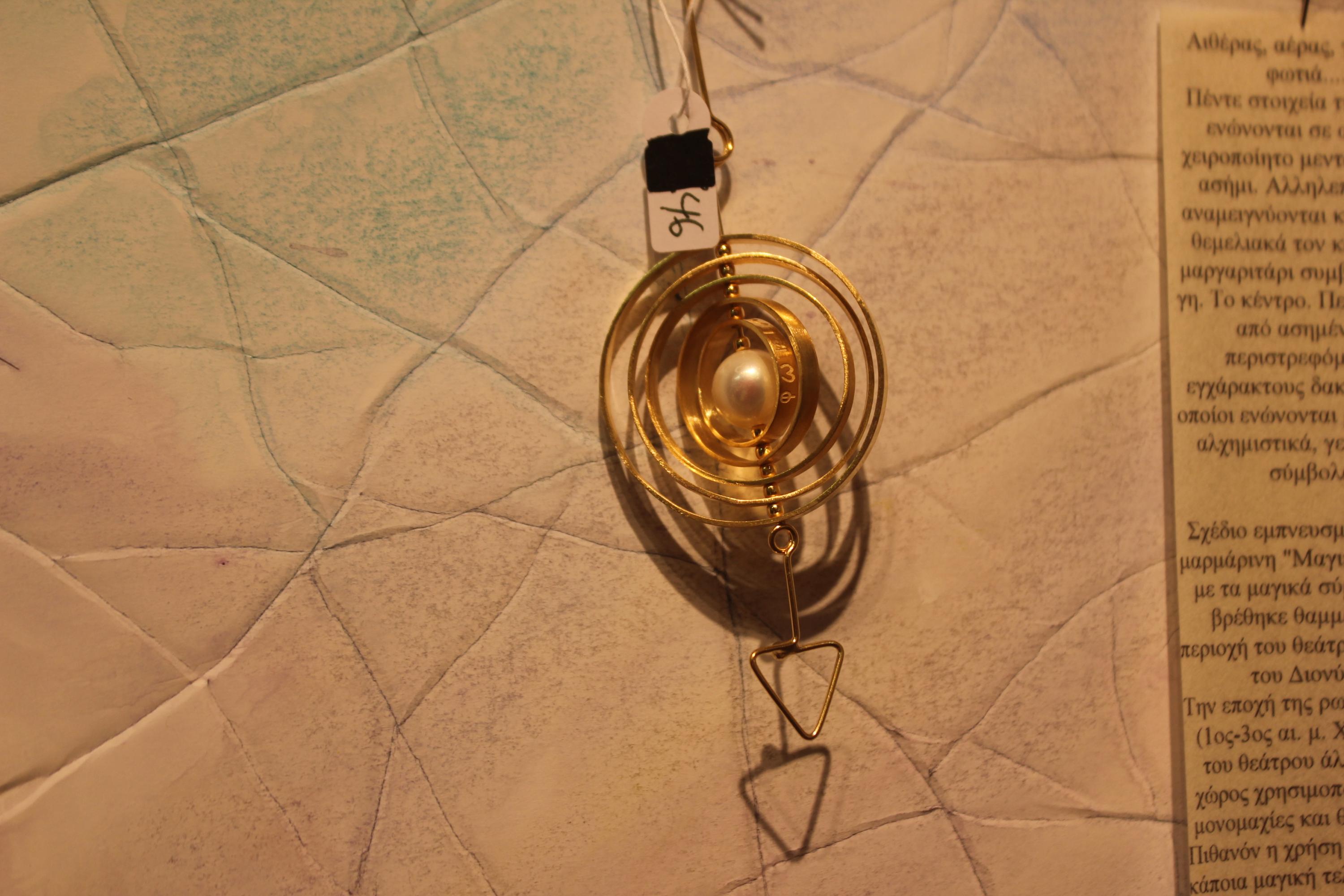 Αιθέρας, αέρας, γη, νερό, φωτιά… πέντε στοιχεία της φύσης ενώνονται στο χειροποίητο μενταγιόν από ασήμι, που είναι εμπνευσμένο από τη μαρμάρινη «Μαγική Σφαίρα» με τα μαγικά σύμβολα που βρέθηκε θαμμένη στην περιοχή του θεάτρου στο ιερό του Διονύσου. Την εποχή της ρωμαιοκρατίας (1ος-3ος αι. μ.Χ.), η μορφή του θεάτρου άλλαξε και ο χώρος χρησιμοποιήθηκε για μονομαχίες και θηριομαχίες. Πιθανόν η χρήση της ήταν για κάποια μαγική τελετή για νίκη στους αγώνες. Η Σφαίρα θεωρείται μαγικό αντικείμενο που σχετίζεται με τη λατρεία του Ήλιου και εκτίθεται σήμερα στο Μουσείο της Ακρόπολης.