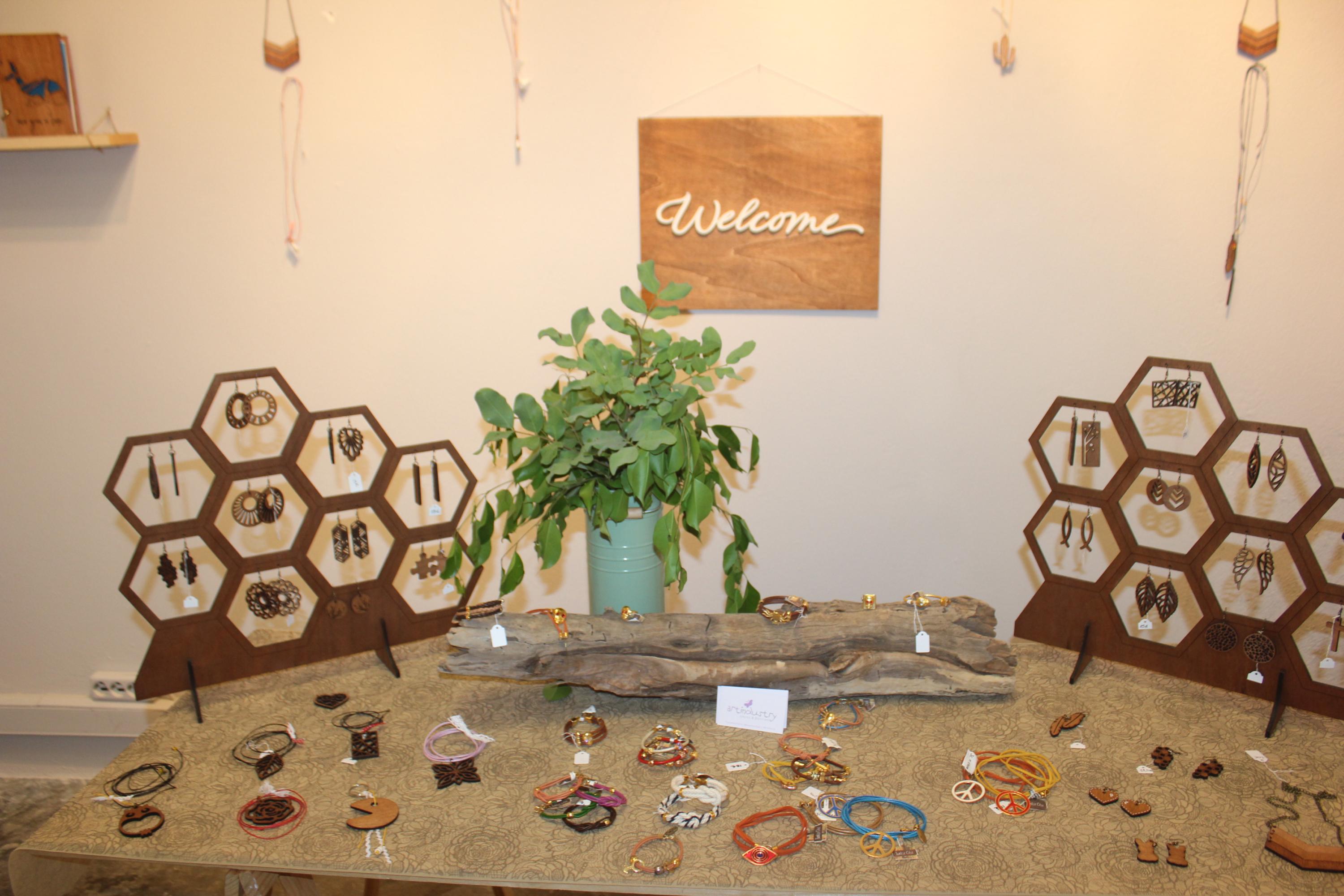 «Στην έκθεση παρουσιάζονται ξύλινες δημιουργίες και δημιουργίες από πλεξιγκλάς και από ύφασμα. Έχουμε τα μηχανήματα που χαράσσουμε και κόβουμε, με μία πιο ιδιαίτερη αγάπη στο κομμάτι του ξύλου», δηλώνει χαρακτηριστικά η κ. Παύλου. Σκουλαρίκια, κρεμαστά για το λαιμό, τρίλιζες, αντικείμενα για παιδική δραστηριότητα και πολλά ακόμη πρωτότυπα προϊόντα μαρτυρούν τις πολλές δυνατότητες που προσφέρει το ξύλο για δημιουργία με στυλ και κομψότητα.