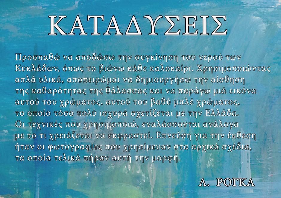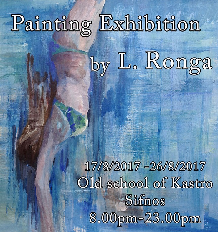 Ο Πολιτιστικός Σύλλογος Σίφνου παρουσιάζει την έκθεση ζωγραφικής «Καταδύσεις», της Λίλλυ Ρόγκα, η οποία θα πραγματοποιηθεί στο Παλαιό Σχολείο Κάστρου από 17.8.2017 έως 26.8.2017, από τις 20:00 έως τις 23:00.