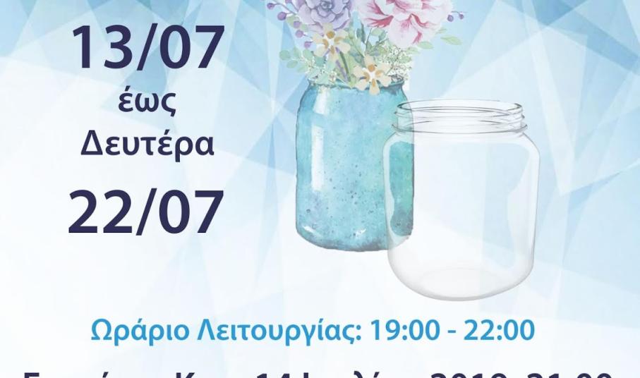 Το παζάρι θα πραγματοποιηθεί από το Σάββατο 13 Ιουλίου έως τη Δευτέρα 22 Ιουλίου 2019, στο βοηθητικό κτίριο της Έπαυλης Τσιροπινά. Οι επισκέπτες του θα έχουν την ευκαιρία να θαυμάσουν και την one art exhibition του Γιάννη Δανέλη, στην οποία θα παρουσιαστεί το έργο που γεννήθηκε από τις δημιουργίες των παιδιών του περσινού εργαστηρίου. Ο καλλιτέχνης τις επεξεργάστηκε και τους έδωσε την τελική μορφή που θα απολαύσουν οι φίλοι του Συλλόγου.