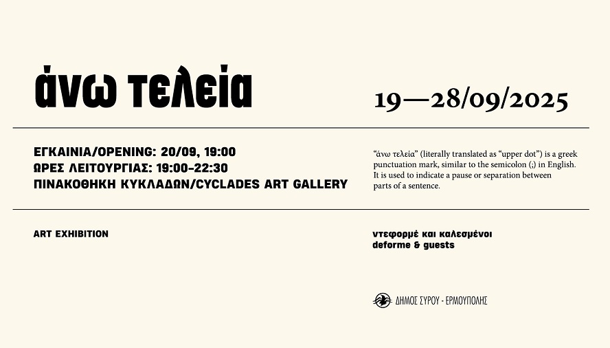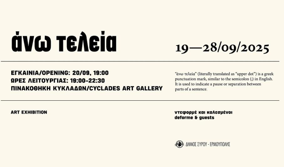 Η έκθεση με τίτλο "άνω τελεία" της ομάδας ντεφορμέ και των καλεσμένων της, στις 19- 28/9/2025, στην Πινακοθήκη Κυκλάδων.