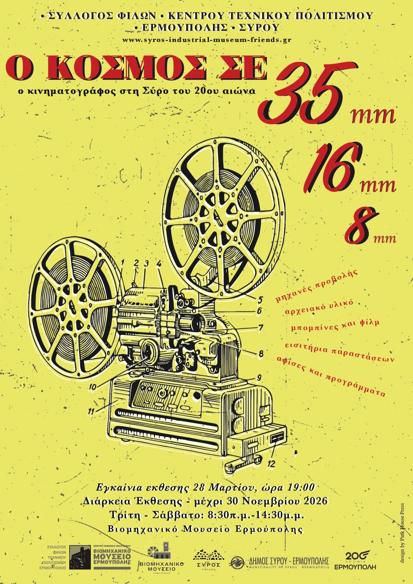 Το Σάββατο 28 Μαρτίου 2026 και ώρα 19.00 θα πραγματοποιηθούν στην αίθουσα των περιοδικών εκθέσεων του Βιομηχανικού Μουσείου Ερμούπολης τα εγκαίνια της έκθεσης με θέμα "Ο κόσμος σε 35, 16, 8 mm...O κινηματογράφος στη Σύρο του 20ού αιώνα", που συνδιοργανώνει ο Σύλλογος Φίλων του ΚΕΤΕΠΟ με τον Δήμο Σύρου-Ερμούπολης.