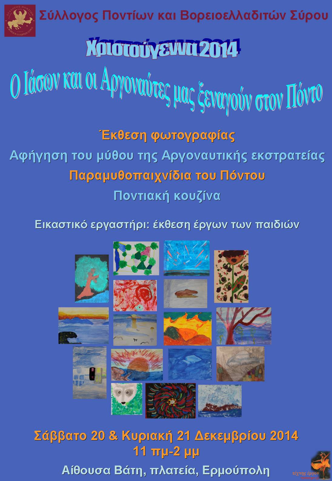 Ο Σύλλογος Ποντίων και Βορειοελλαδιτών Σύρου διοργανώνει τη Χριστουγεννιάτικη εκδήλωσή του με θέμα  "Ο Ιάσων και οι Αργοναύτες μας ξεναγούν στον Εύξεινο Πόντο" το Σάββατο 20 και την Κυριακή 21 Δεκεμβρίου, στην αίθουσα "Βάτη".