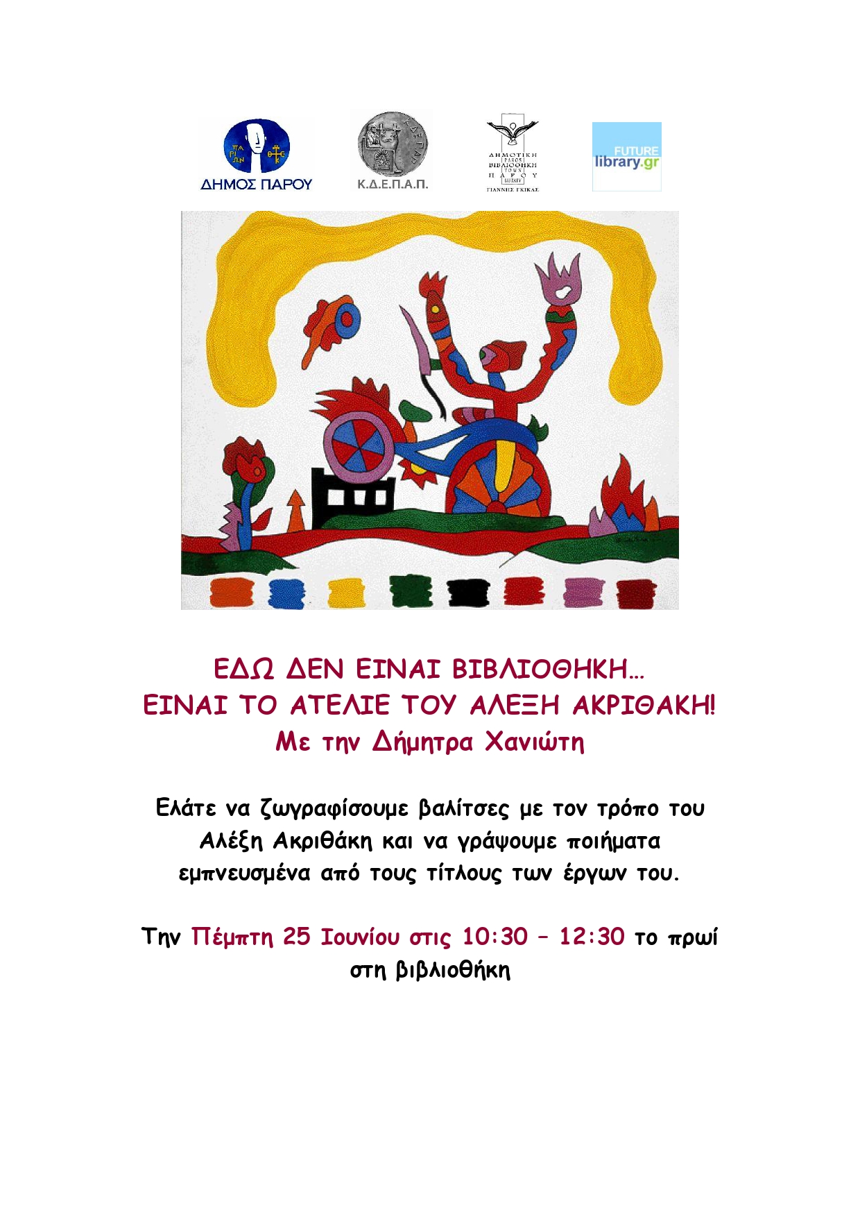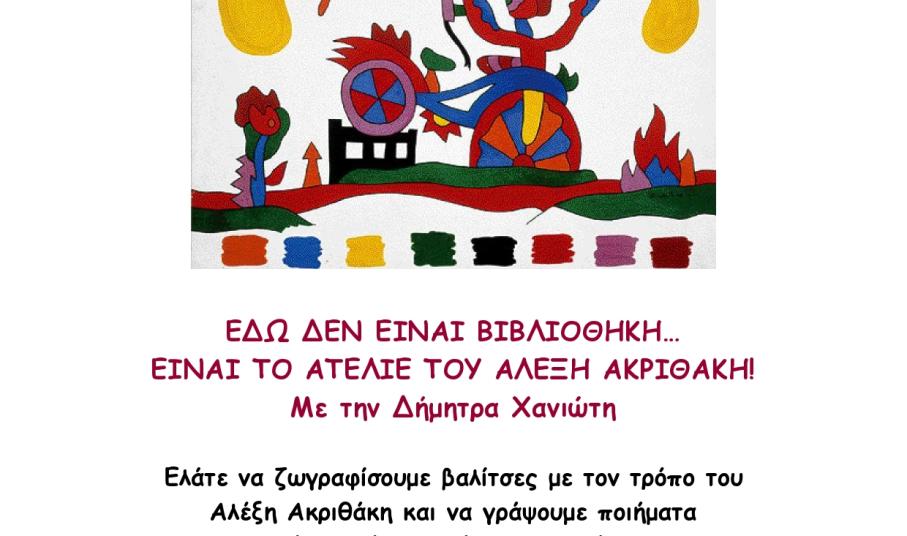 Την Πέμπτη 25 Ιουνίου στις 10:30, η Δήμητρα Χανιώτη καλεί τους μικρούς καλλιτέχνες του νησιού να ζωγραφίσουν βαλίτσες με τον τρόπο του Αλέξη Ακριθάκη και να γράψουν ποιήματα εμπνευσμένα από τους τίτλους των έργων του.