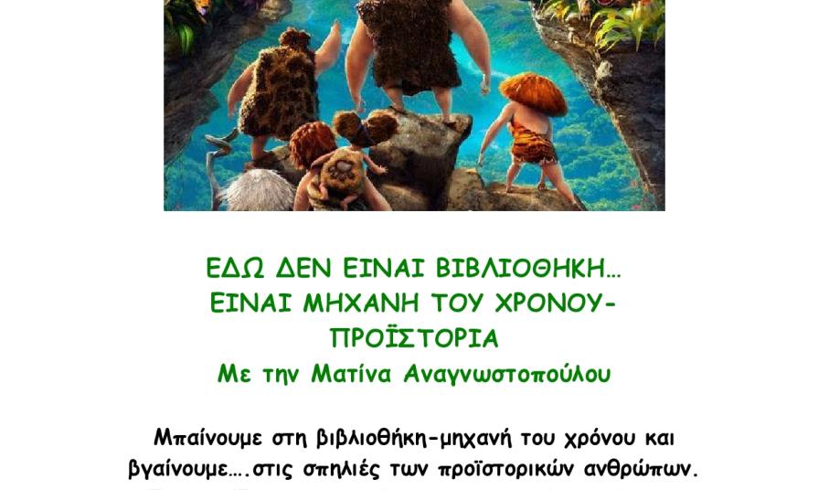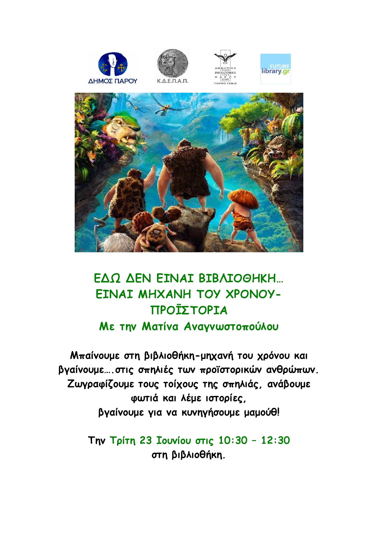 Στο πλαίσιο της Καλοκαιρινής Εκστρατείας στη Δημοτική Βιβλιοθήκη Πάρου “Γιάννης Γκίκας”, οι μικροί φίλοι, κρατώντας το χέρι της Ματίνας Αναγνωστοπούλου ταξιδεύουν την Τρίτη 23 Ιουνίου (10:30 – 12:30) στις σπηλιές των προϊστορικών ανθρώπων. Ζωγραφίζουν τους τοίχους της σπηλιάς, ανάβουν φωτιά και λένε ιστορίες, βγαίνουν για να κυνηγήσουν μαμούθ.
