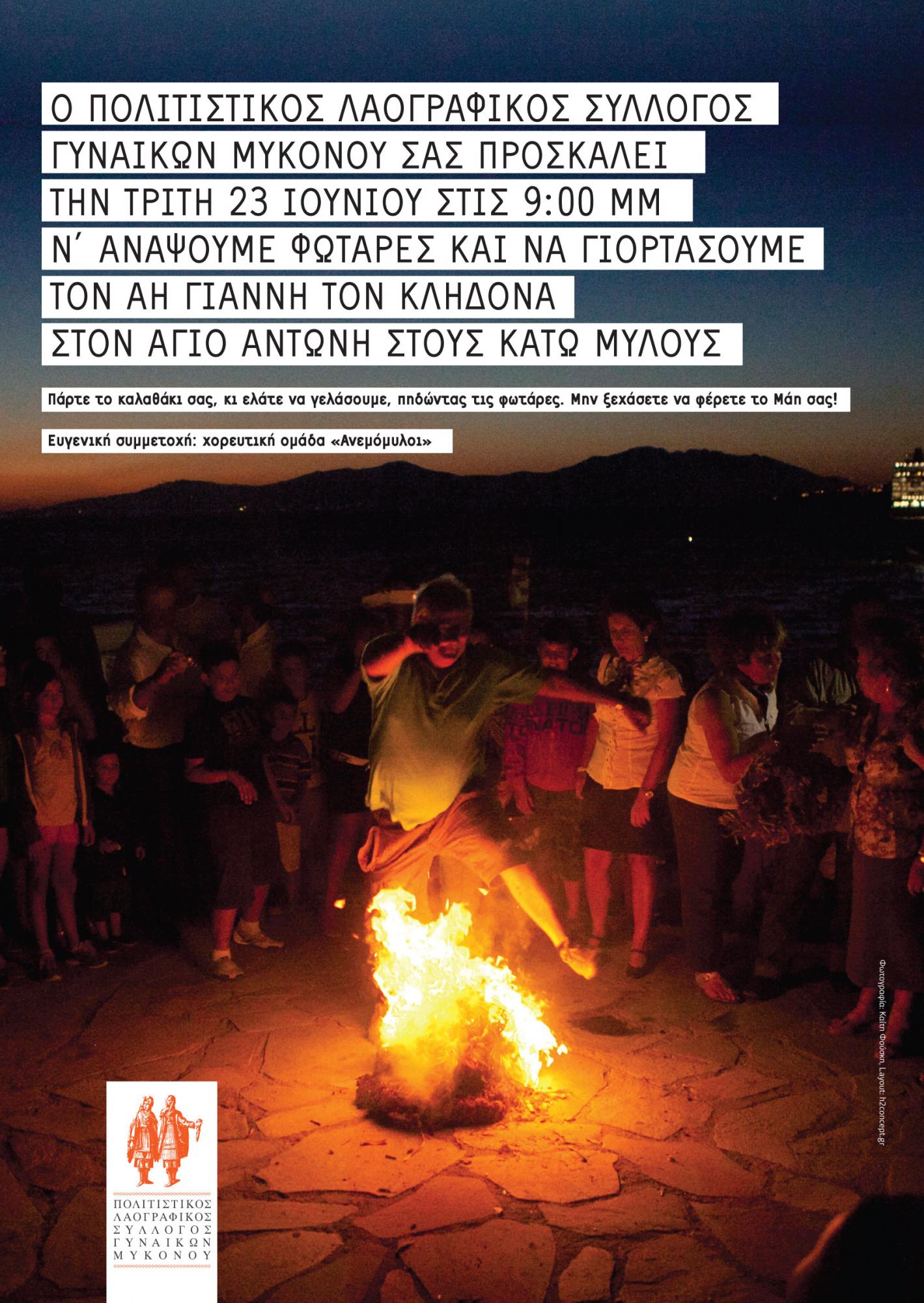 Ο Πολιτιστικός Λαογραφικός Σύλλογος Γυναικών Μυκόνου, προσκαλεί τους φίλους του την Τρίτη 23 Ιουνίου στις 21:00 στη γιορτή του Άη Γιάννη του Κλήδονα.
