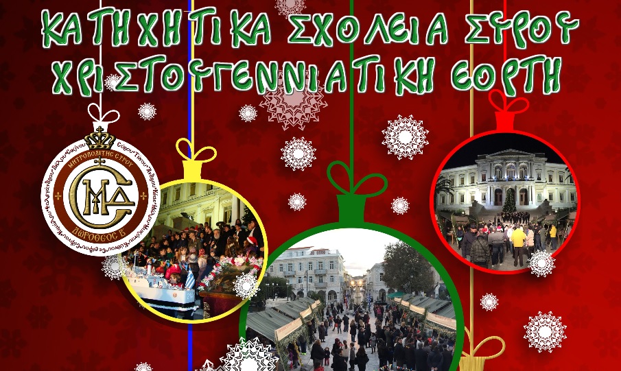 Τις άγιες ημέρες των Χριστουγέννων θα υποδεχτούν και φέτος οι μαθητές των Κατηχητικών Σχολείων της Σύρου, τα οποία καλούν το κοινό του νησιού να γιορτάσει μαζί τους την Κυριακή 20 Δεκεμβρίου από 13:30 έως 17:30, στην Πινακοθήκη Κυκλάδων.