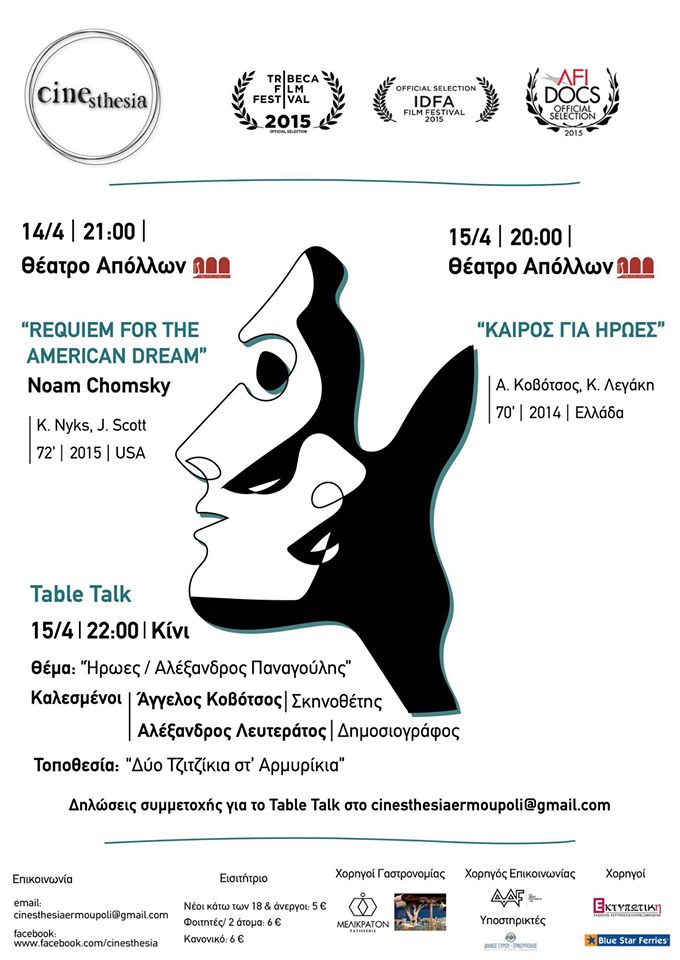 Τι σημαίνει “ήρωας” στις μέρες μας; Ποιος ήταν ο Ηλίας Δημητρακόπουλος και τι λέει ο Noam Chomsky για το Αμερικάνικο όνειρο; Πόσοι ξέρουν τον Αλέξανδρο Παναγούλη; Και τι καιρό θα κάνει στο table talk στα “Δύο Τζιτζίκια στα Αρμυρίκια” την Παρασκευή 15 /4 στις 10 μ.μ μεταξύ κρασιού, φαγητού, κουβέντας και θάλασσας;