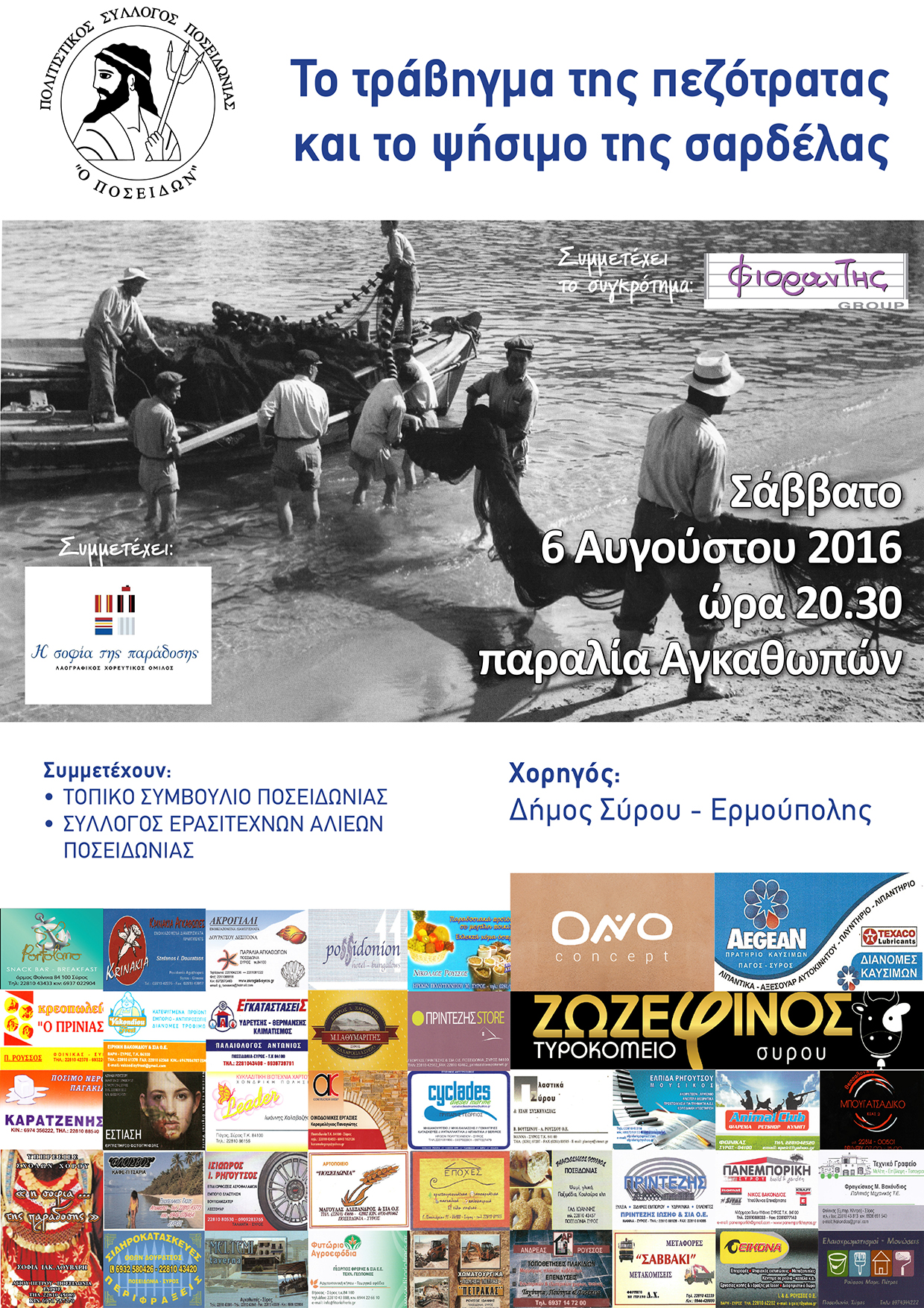 Ο Πολιτιστικός Σύλλογος Ποσειδωνίας «ο Ποσειδών» σε συνεργασία με το Δήμο Σύρου - Ερμούπολης, το Τοπικό Συμβούλιο Ποσειδωνίας και το Σύλλογο των ερασιτεχνών αλιέων της Ποσειδωνίας, σας προσκαλούν το Σάββατο 6 Αυγούστου 2016 και ώρα 20:30 στην παραλία των Αγκαθωπών, στην νησιώτικη εκδήλωση «Το τράβηγμα της πεζότρατας και το ψήσιμο της σαρδέλας».