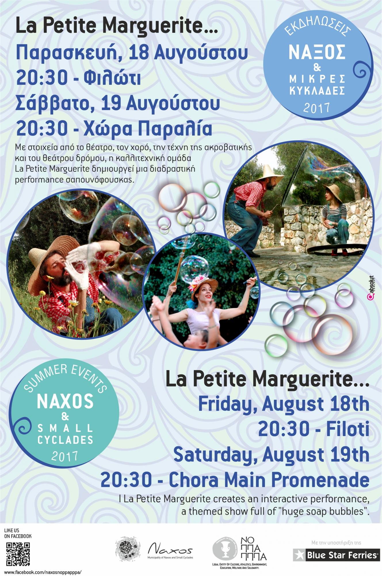 Με στοιχεία από το θέατρο, τον χορό, την τέχνη της ακροβατικής και του θεάτρου δρόμου, η καλλιτεχνική ομάδα "La Petite Marguerite" δημιουργεί την Παρασκευή `8 Αυγούστου και ώρα 20:30, ατο Φιλώτι Νάξου, μια διαδραστική performance σαπουνόφουσκας, ένα θεματικό show γεμάτο τεράστιες σαπουνόφουσκες που ζωντανεύει και ενεργοποιεί το παραμυθιακό, την φαντασία, το όνειρο.