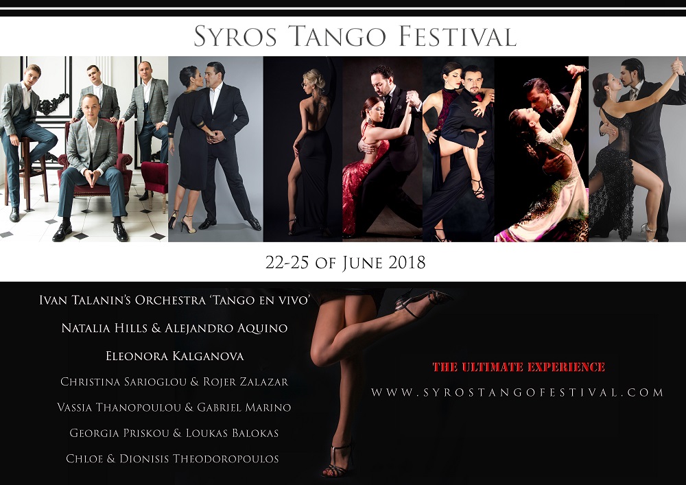 Στο πλαίσιο του πολιτιστικού προγράμματος του Δήμου Σύρου – Ερμούπολης, «Σύρος Πολιτισμός 2018», ο Σύλλογος «Φίλοι Αργεντίνικου Τάνγκο» πραγματοποιεί το Διεθνές Φεστιβάλ Αργεντίνικου Τάνγκο, από τις 22 έως τις 25 Ιουνίου 2018, με καλεσμένους επαγγελματίες χορευτές και ορχήστρα παγκοσμίου φήμης με πρωταθλητές Ευρώπης, Ρωσίας και Ελλάδος.
