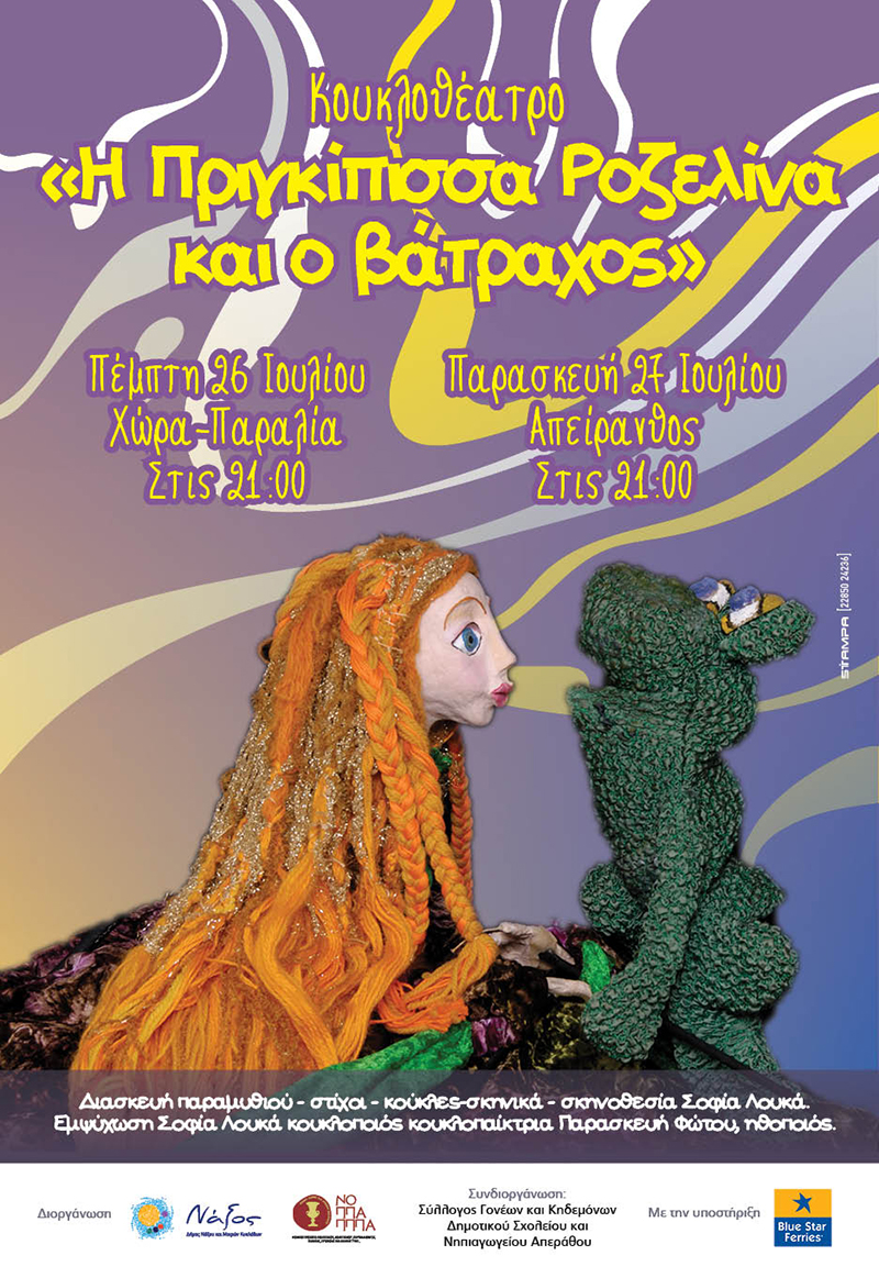Σας ενημερώνουμε ότι λόγω του τριήμερου εθνικού πένθους για τα θύματα των πρόσφατων πυρκαγιών, η εκδήλωση με το κουκλοθέατρο Ανέμη «Η Ροζελίνα και ο Βάτραχος» που ήταν προγραμματισμένη για σήμερα 26/07/2018 στη Χώρα της Νάξου, αναβάλλεται και θα πραγματοποιηθεί την Κυριακή 29/07/2018 στις 21:00 στην παραλία Χώρας Νάξου.