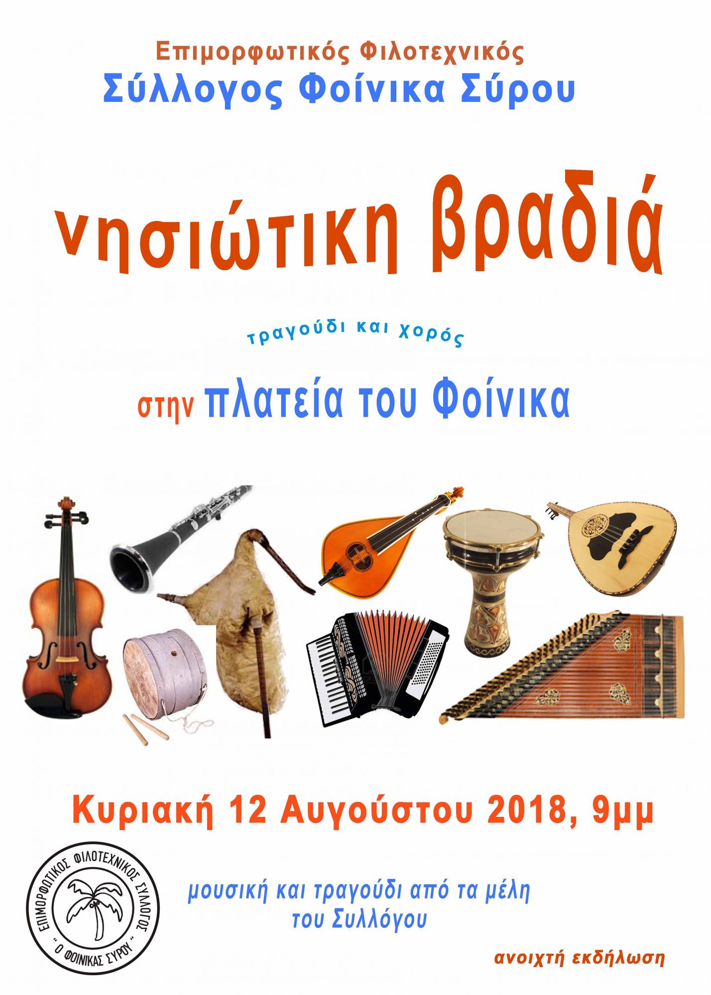 Ο Επιμορφωτικός Φιλοτεχνικός Σύλλογος Φοίνικα Σύρου διοργανώνει Nησιώτικη βραδιά με τραγούδι και χορό στην πλατεία του Φοίνικα την Κυριακή 12 Αυγούστου 2018, στις 9μμ με μουσική και τραγούδι από τα μέλη του Συλλόγου.