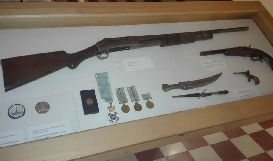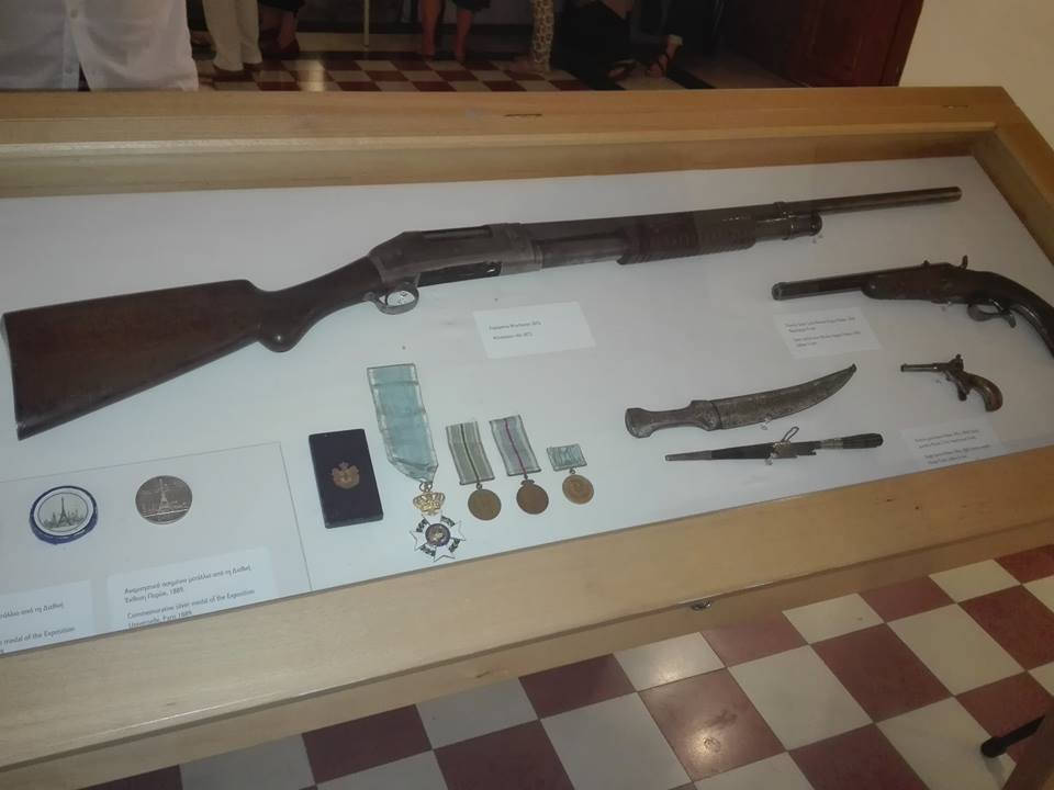 Στον κύριο εκθεσιακό χώρο παρουσιάζονται σε κορνίζες και προθήκες περίπου 110 φωτογραφίες, έγγραφα (τα πιο ενδιαφέροντα έχουν μεταγραφεί), περισσότερα από 70 επιστολικά δελτάρια και αντικείμενα που βρέθηκαν στο χρηματοκιβώτιο όπως, όπλα, αρχαία νομίσματα, μετάλλια, είδη γραφείου, είδη καπνιστού και συλλεκτικά ενθύμια.
