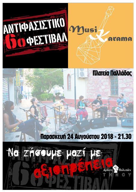 Το 6ο αντιφασιστικό φεστιβάλ της Δράσης Πολιτών Τήνου διοργανώνεται και φέτος με μία ανοικτή συναυλία την Παρασκευή 24 Αυγούστου στις 21.30 στην πλατεία της Παλλάδας (μπροστά από την ταβέρνα Άγκυρα) και μία προβολή του ντοκιμαντέρ "Ζωγραφίζοντας..." που έγινε την Τετάρτη 22 Αυγούστου 2018.