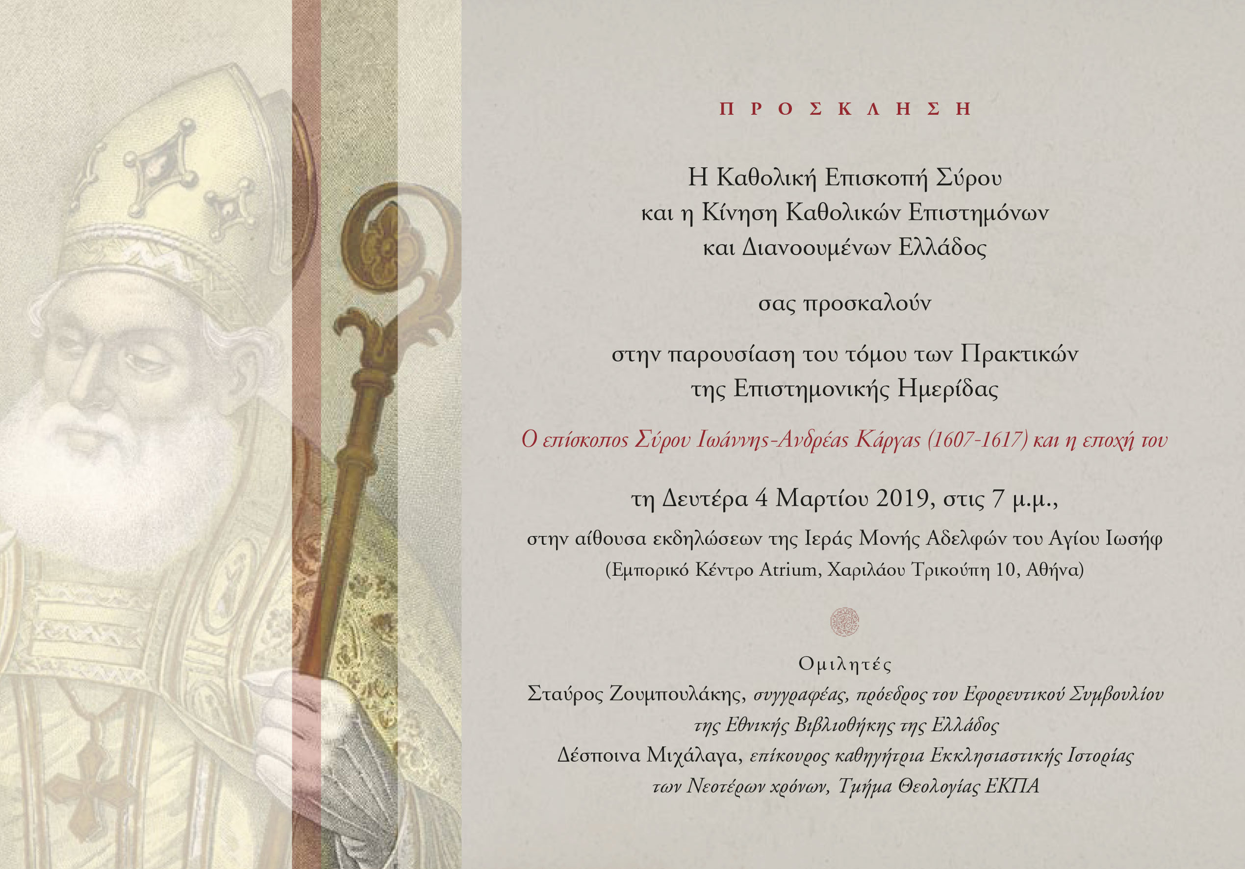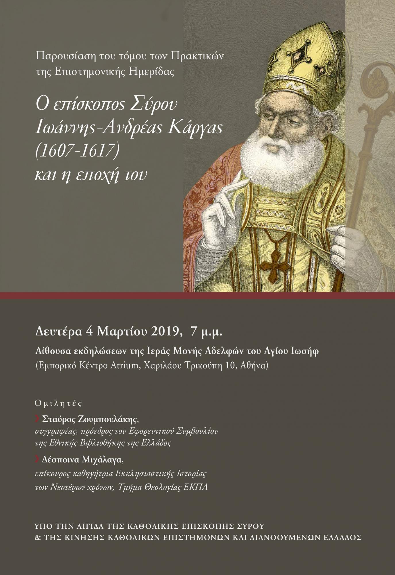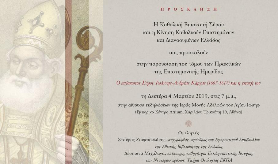 Η Καθολική Επισκοπή Σύρου και η Κίνηση Καθολικών Επιστημόνων και Διανοουμένων της Ελλάδας σας προσκαλούν στην παρουσίαση του τόμου των πρακτικών της Επιστημονικής Ημερίδας "Ο Επίσκοπος Σύρου Ιωάννης Ανδρέας Κάργας και η εποχή του" τη Δευτέρα 4 Μαρτίου (7μμ) στην αίθουσα εκδηλώσεων της Ιεράς Μονής Αδελφών του Αγίου Ιωσήφ (Εμπορικό Κέντρο Attrium).