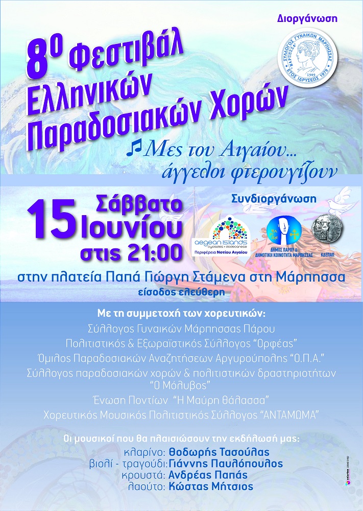 Ο Σύλλογος Γυναικών Μάρπησσας  Πάρου σε συνεργασία με την  Περιφέρεια  Νοτίου  Αιγαίου, το Δήμο  Πάρου, την ΚΔΕΠΑΠ και τη Δημοτική  Κοινότητα  Μάρπησσας  σας  καλεί στο                                            8ο Φεστιβάλ Ελληνικών Παραδοσιακών Χορών που θα γίνει το                              Σάββατο 15 Ιουνίου 2019 και ώρα 21:00 στην Πλατεία Παπά Γιώργη Στάμενα στη Μάρπησσα .