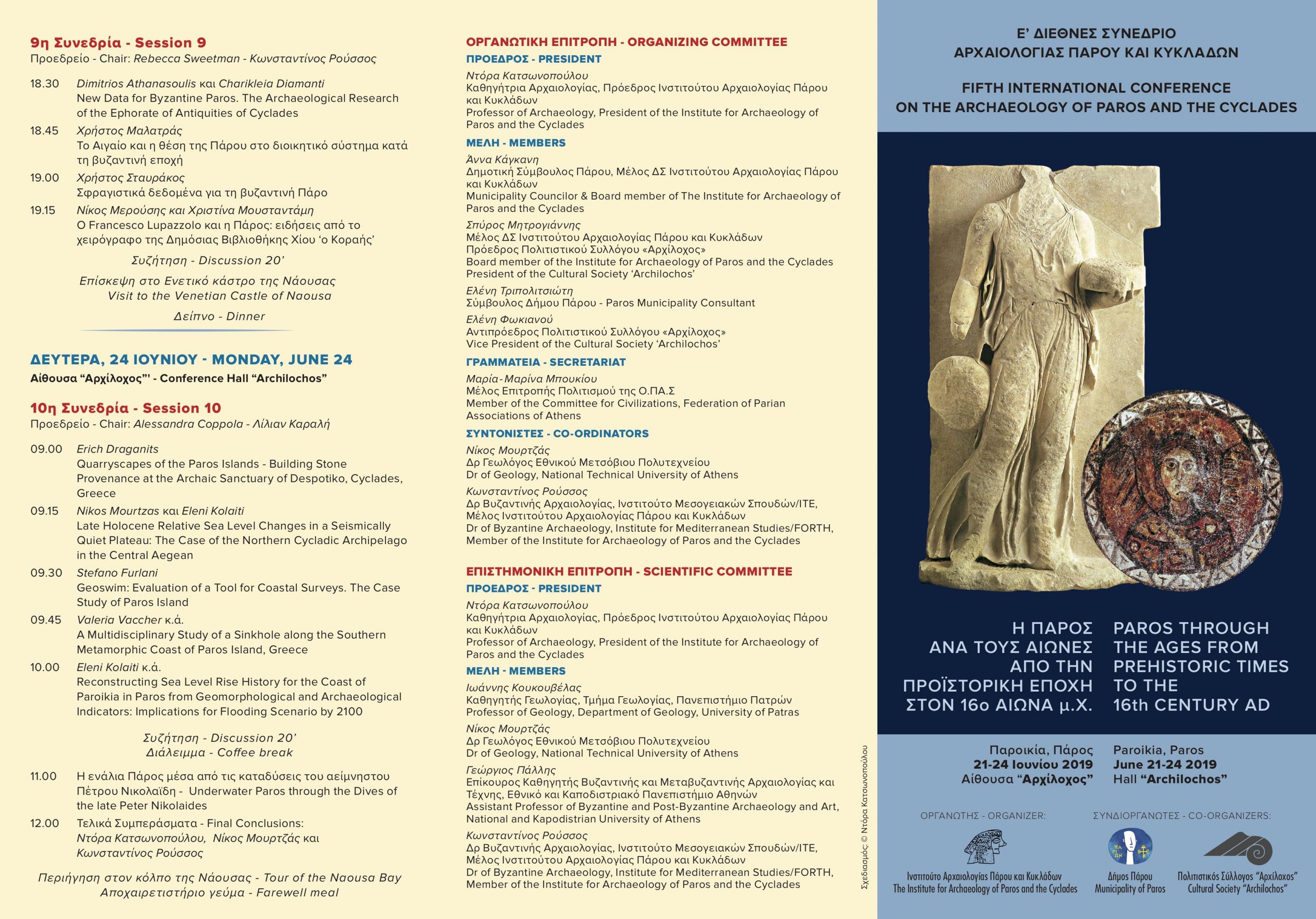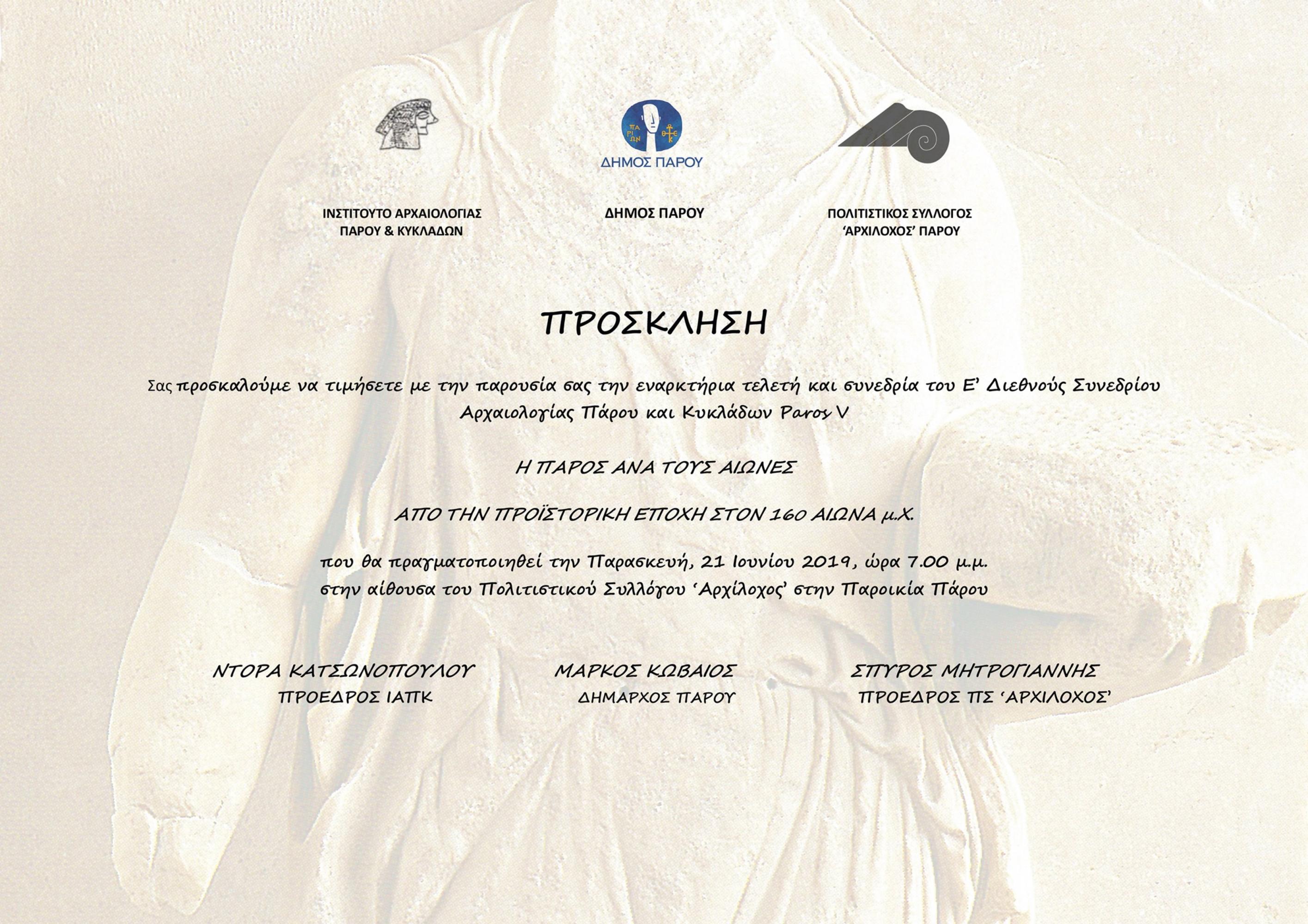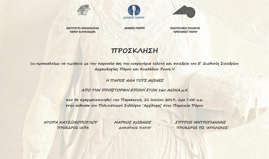 Ο Δήμος Πάρο, ο Πολιτιστικός Σύλλογος Πάρου "Αρχίλοχος" και το Ινστιτούτο Αρχαιολογίας Πάρου και Κυκλάδων, προσκαλούν το κοινό στην εναρκτήρια τελετή και συνεδρία του πέμπτου Διεθνούς Συνεδρίου Αρχαιολογίας Πάρου και Κυκλάδων, με θέμα "Η Πάρος ανά τους αιώνες: Από την Προϊστορική εποχή στον 16ο αιώνα μ.Χ".