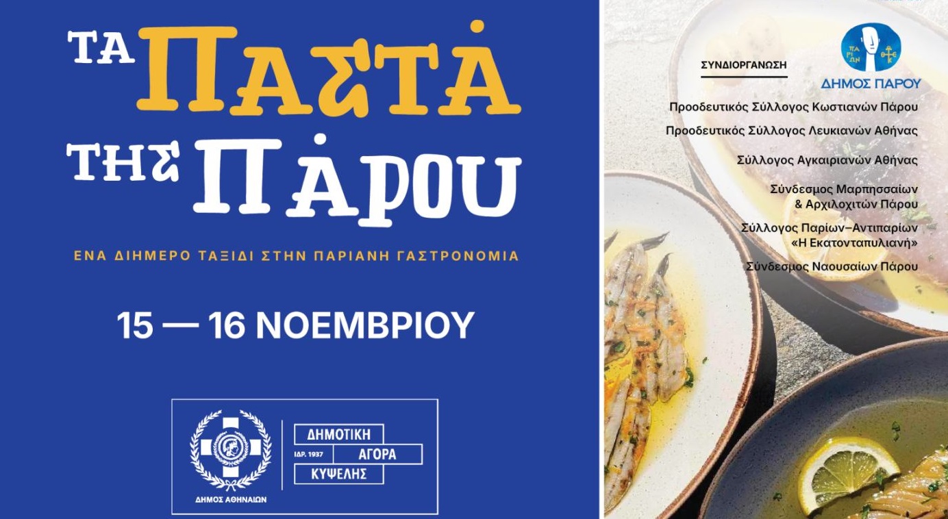 Η Ομοσπονδία Παριανών Συλλόγων της Αθήνας (Ο.ΠΑ.Σ.), σε συνεργασία με τον τοπικό σύλλογο Πάρου «ΝΑΙΑΣ», πραγματοποιεί στις 15 & 16 Νοεμβρίου 2025, στη Δημοτική Αγορά της Κυψέλης, τη γαστρονομική και πολιτιστική εκδήλωση με τίτλο «Τα Παστά της Πάρου | Παράδοση – Γεύση - Εμπειρία».