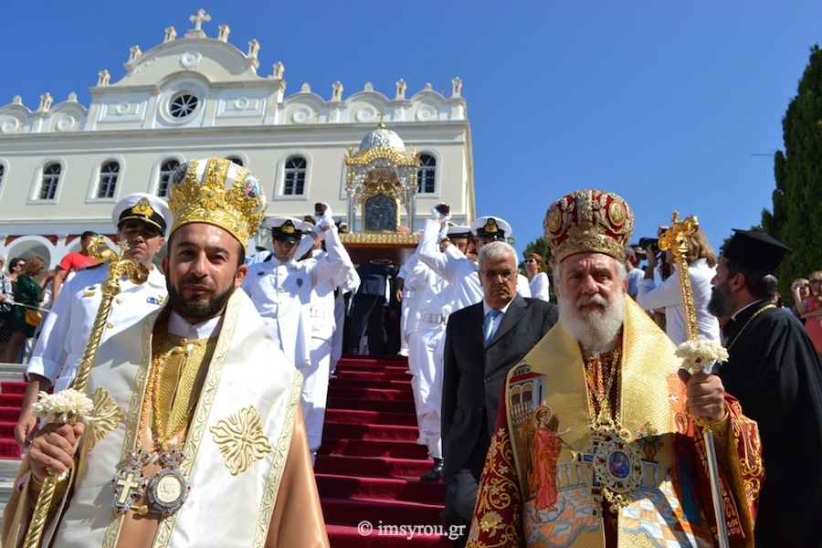 Χιλιάδες πιστοί από την Ελλάδα και το εξωτερικό συμμετείχαν στη μεγάλη Θεομητορική Εορτή της Κοιμήσεως της Θεοτόκου στην Τήνο, παρουσία του Γενικού Γραμματέα Αποκεντρωμένης Διοίκησης, των Αρχηγών του ΓΕΝ και του Λιμενικού Σώματος, εκπροσώπων του Στρατού και των Σωμάτων Ασφαλείας, καθώς και των τοπικών Αυτοδιοικητικών Αρχών.