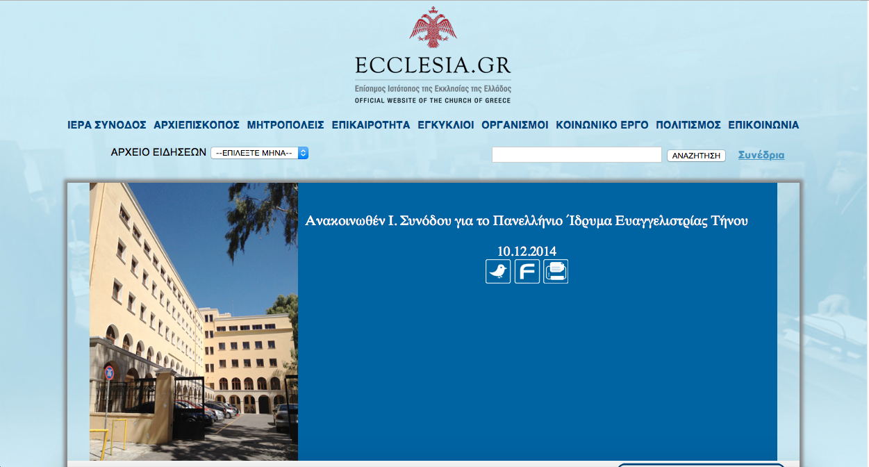 «Η Ιερά Σύνοδος έλαβε γνώση μέσω των Μ.Μ.Ε. για τις οργανωμένες πράξεις κατατρομοκρατήσεως και προπηλακισμών σε βάρος του Σεβ. Μητροπολίτη Σύρου και Τήνου κ. Δωροθέου Β΄ και των άλλων εκλεκτόρων κατά την προσέλευσή τους την Κυριακή, 7 Δεκεμβρίου 2014, στον αύλειο χώρο του Ιερού Ναού του Πανελληνίου Ιερού Ιδρύματος Ευαγγελιστρίας Τήνου (Π.Ι.Ι.Ε.Τ.), προκειμένου να ψηφίσουν για την ανάδειξη της νέας Διοικούσας Επιτροπής του Π.Ι.Ι.Ε.Τ. βάσει του Νόμου 349/1976. Ο Σεβ. Μητροπολίτης Σύρου και Τήνου δέχθηκε σωματική βία, εξυβρίσεις και απειλές από το συγκεντρωμένο πλήθος, που είχε προσκληθεί εκεί από τον Δήμαρχο Τήνου. Οι σκηνές, που διαδόθηκαν πανελλαδικώς, ουδόλως παρέπεμπαν σε προαύλιο ορθοδόξου Ιερού Ναού. Ορισμένοι στην νήσο Τήνο δεν φαίνεται να αντιλαμβάνονται ότι με τις εικόνες αυτές προσβάλλεται η ευλάβεια όλων των ορθοδόξων χριστιανών Ελλήνων, εκτίθεται και πλήττεται το ίδιο το κύρος του Ιερού Ιδρύματος του νησιού τους. Επιπλέον η Ιερά Σύνοδος διαπιστώνει με απορία ότι το τελευταίο διάστημα Ρωμαιοκαθολικοί της Τήνου, Δημοτικοί Σύμβουλοι και δημότες, συμμετέχουν, ως μη όφειλαν, σε αποφάσεις του Δημοτικού Συμβουλίου, καθώς και σε οργανωμένες δράσεις υπό την ηγεσία του Δημάρχου σχετικά με θέματα του Ιδρύματος της Παναγίας Τήνου, παραβλέποντες ότι πρόκειται για θρησκευτικό, ορθόδοξο Ιερό Ίδρυμα και όχι για δημοτικό Ίδρυμα.