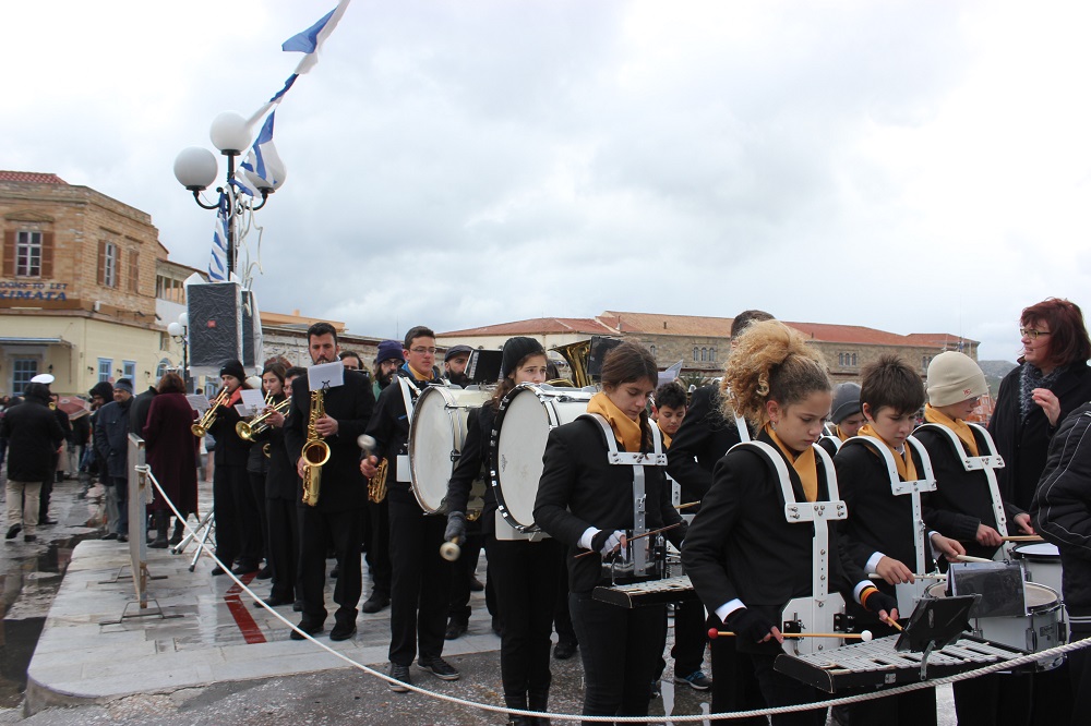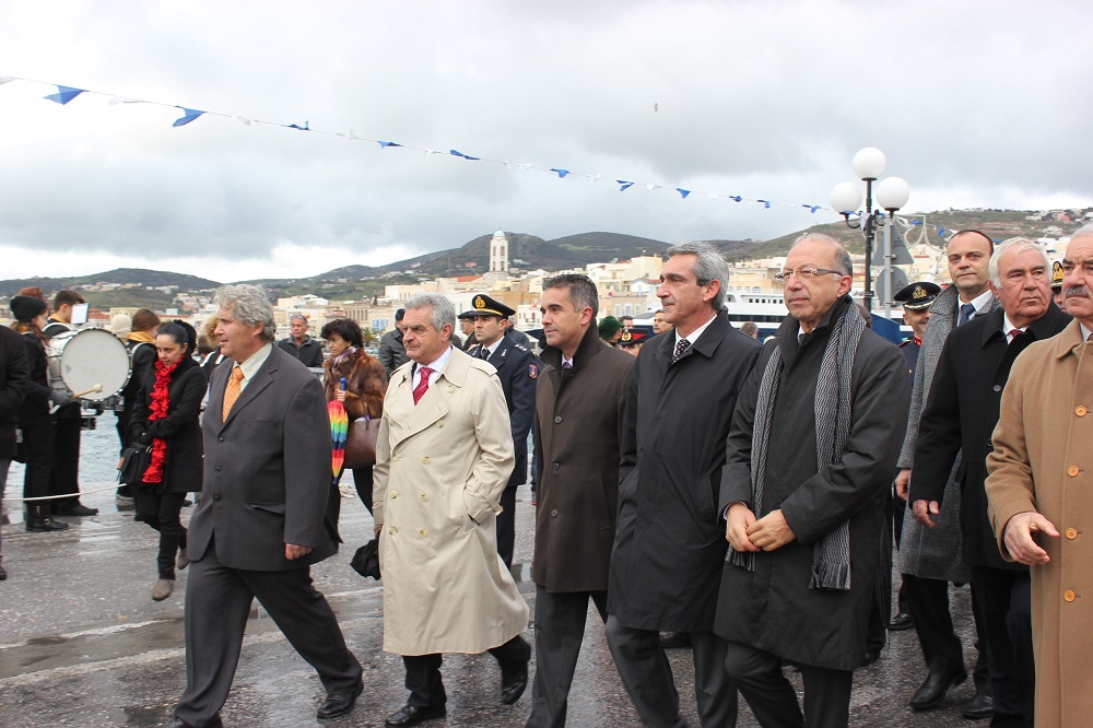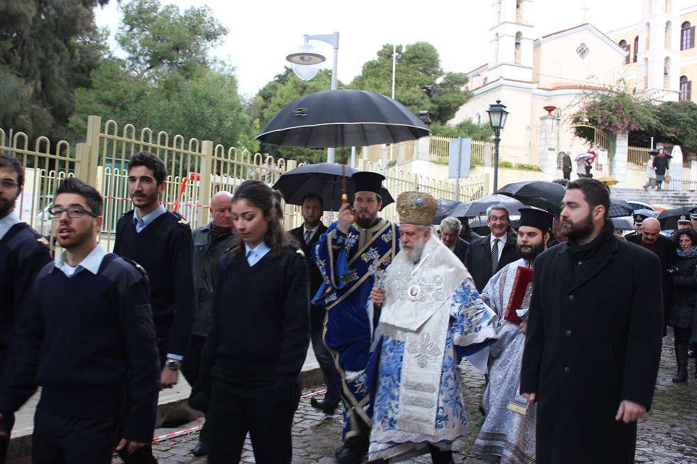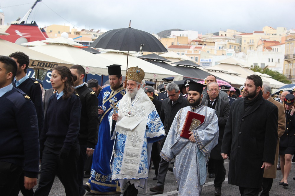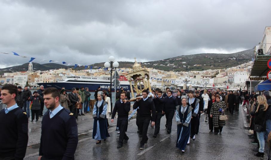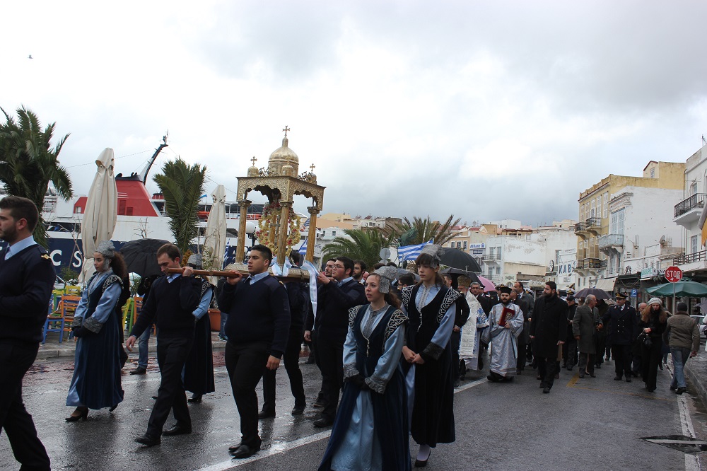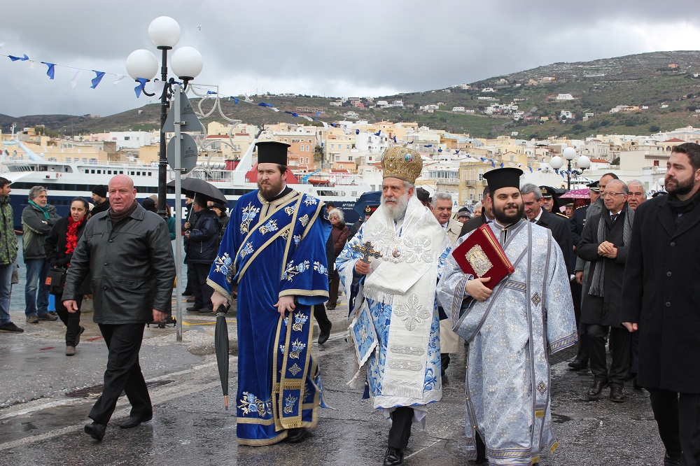 Στον πρώτο όροφο της Ακαδημίας Εμπορικού Ναυτικού (ΑΕΝ) ακολούθησε λιτή γιορτή παρουσία του Μητροπολίτη Σύρου, ο οποίος ευχαρίστησε όλους τους συμμετέχοντες στον εορτασμό, απευθύνοντας ταυτόχρονα ευχές προς όλους τους νησιώτες του Νοτίου Αιγαίου. “Έχουμε γενναίους κολυμβητές που κολύμπησαν για τον Τίμο Σταυρό. Φέτος επαναλήφθηκε η ρίψη για να είμαστε ακριβοδίκαιοι και να πέσουν όλοι από το ίδιο σημείο. Η ευλογία είναι η ίδια για όλα τα παιδιά διότι είχαν αυτή την αντοχή, την πνευματική και σωματική, να τηρήσουν το έθιμο. Τους ευχαριστούμε πολύ και τους ευχόμαστε καλή πρόοδο να έχουν στη ζωή τους” δήλωσε αρχικά ο κκ Δωρόθεος Β΄, λέγοντας στη συνέχεια πως, παρά το κρύο και οι πιστοί ακολούθησαν με ιδιαίτερη ευλάβεια τη λιτανευτική πομπή μέχρι την πλατεία Κανάρη. “Να πούμε χρόνια πολλά σε όλο τον λαό μας σήμερα. Παρά το κρύο, εμείς τιμήσαμε το έθιμο με την παρουσία του κ. Περιφερειάρχη, του Δημάρχου, όλων των εκπροσώπων της Αυτοδιοίκησης, των Σωμάτων Ασφαλείας, του κ. επί τιμή Νομάρχη, του κ. επί τιμή Δημάρχου, των εκλεκτών διδασκάλων και των δικαστικών, των σπουδαστών της Ακαδημίας Εμπορικού Ναυτικού”.