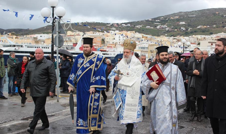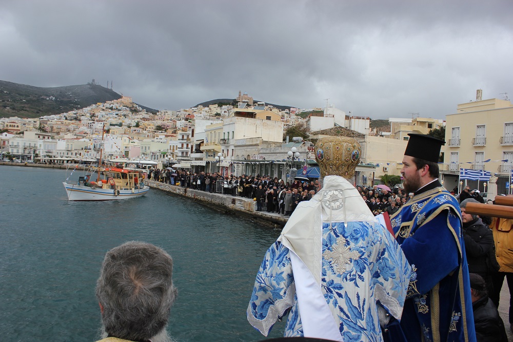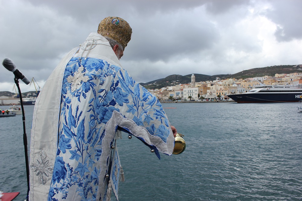 Οι λατρευτικές εκδηλώσεις ξεκίνησαν από νωρίς το πρωί με την τέλεση της καθιερωμένης αρχιερατικής Θείας Λειτουργίας στον Μητροπολιτικό Ναό Μεταμορφώσεως του Σωτήρος, χοροστατούντος του Σεβασμιωτάτου Μητροπολίτη Σύρου, κ. Δωροθέου Β΄, ενώ ακολούθησε ο αγιασμός των υδάτων, η δοξολογία στην πλατεία Κανάρη και η ρίψη του Τιμίου Σταυρού.