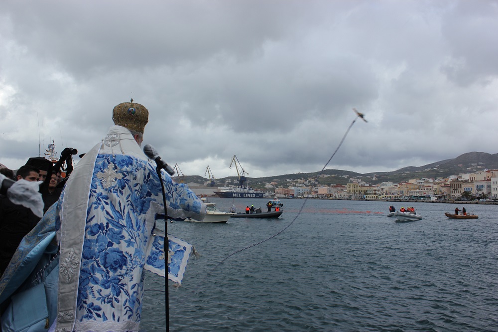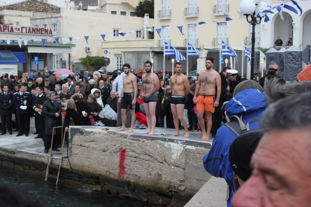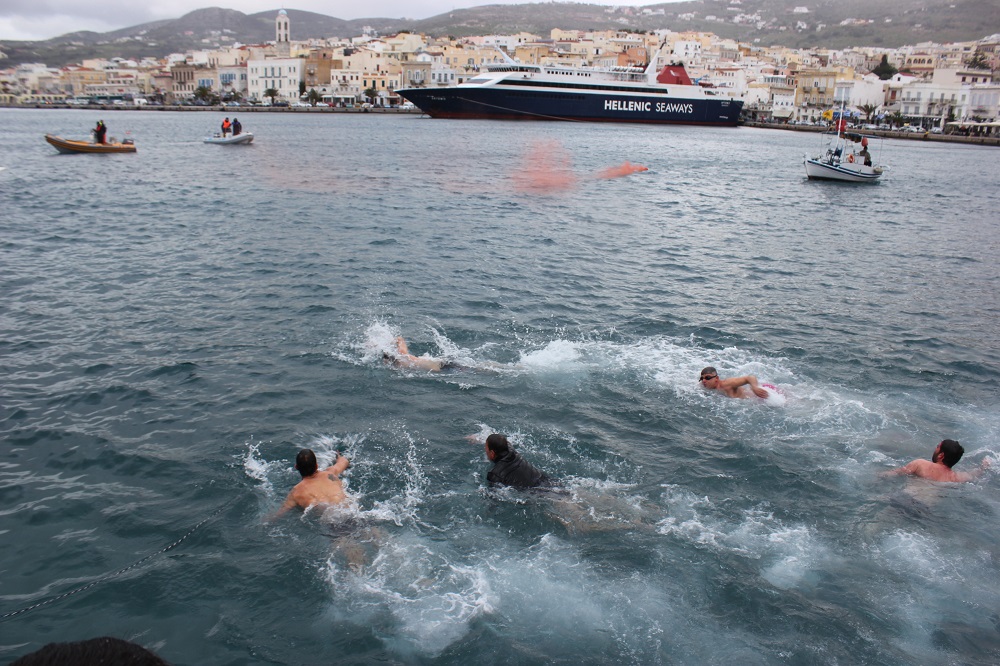 Πνευματικό μεγαλείο επέδειξαν πιστοί, αλλά και γενναίοι κολυμβητές που ρίχτηκαν στην κρύα θάλασσα μετά τη ρίψη του Τιμίου Σταυρού, συμμετέχοντας στον εορτασμό των Αγίων Θεοφανείων στη Σύρο, χθες το πρωί, αψηφώντας κάθε εμπόδιο που έθεταν η χαμηλή θερμοκρασία, η βροχόπτωση και το πρωτόγνωρο κρύο.