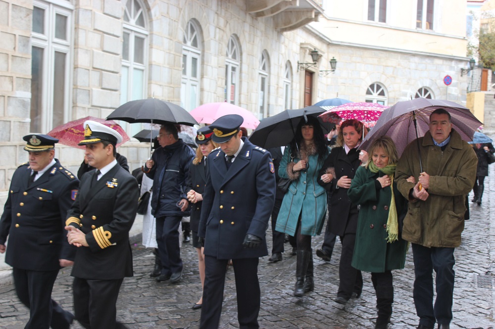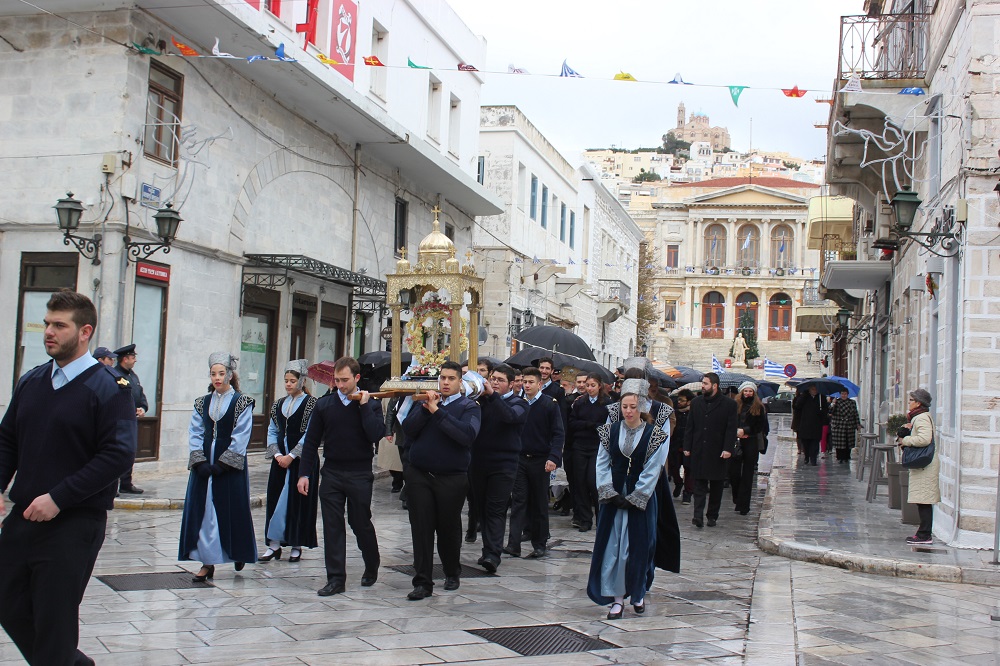 Ειδικότερα, η λιτανευτική πομπή ξεκίνησε από τον Μητροπολιτικό Ναό στην Ερμούπολη, αμέσως μετά το πέρας της Θείας Λειτουργίας, με τους πιστούς, το πλήρωμα του Λυκείου Ελληνίδων με τις παραδοσιακές φορεσιές και τους Αυτοδιοικητικούς να συνοδεύουν τον Τίμιο Σταυρό έως την πλατεία Κανάρη. Η πομπή διέσχισε τις κεντρικές οδούς της πόλης, φθάνοντας με τα ένστολα τμήματα στο σημείο όπου και κορυφώθηκε ο εορτασμός. Ιδιαίτερη στιγμή αποτέλεσε η παρουσία των μελών της Φιλαρμονικής του Δήμου Σύρου – Ερμούπολης, η οποία απέδωσε με εξαιρετικό τρόπο θρησκευτικά εμβατήρια πριν και μετά το παραδοσιακό θρησκευτικό έθιμο της ρίψης του Σταυρού στη θάλασσα.