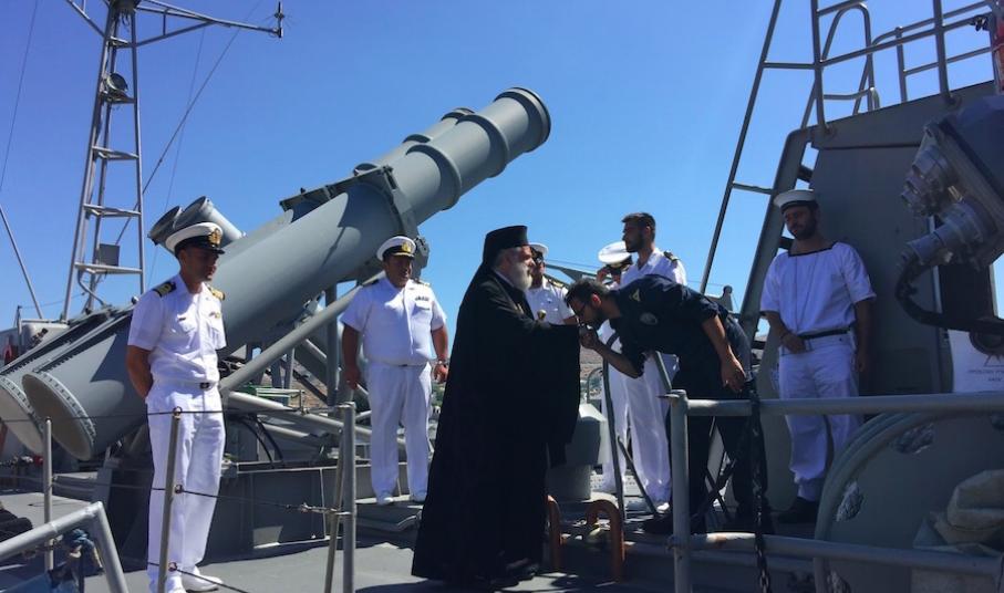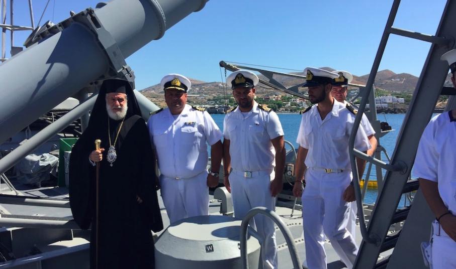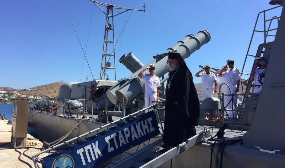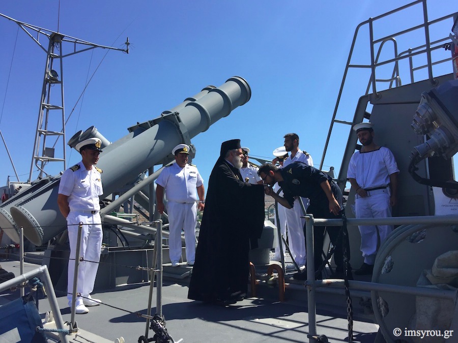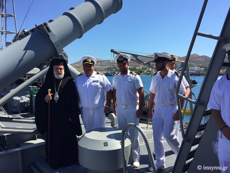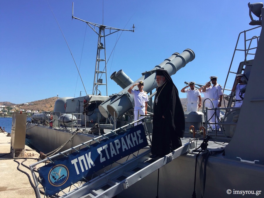 Ο Σεβασμιώτατος κ. Δωρόθεος Β΄, συνοδευόμενος από τον Αρχιερατικό Επίτροπο Σύρου, Πρωτοπρ. Φλαβιανό Αλμπέσκου και το Διοικητή της ΠΝΒ Σύρου, επισκέφθηκε σήμερα το πρωί το Πολεμικό "ΣΤΑΡΑΚΗΣ", κατόπιν σχετικής προσκλήσεως του Κυβερνήτη και των ανδρών του πληρώματός του, με τους οποίους συζήτησε και προς τους οποίους ευχήθηκε καλούς, ειρηνικούς και ασφαλείς πλόας, δεχθείς αναμνηστική της επισκέψεώς του πλακέτα.