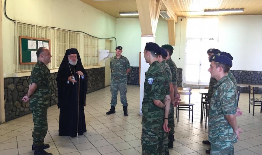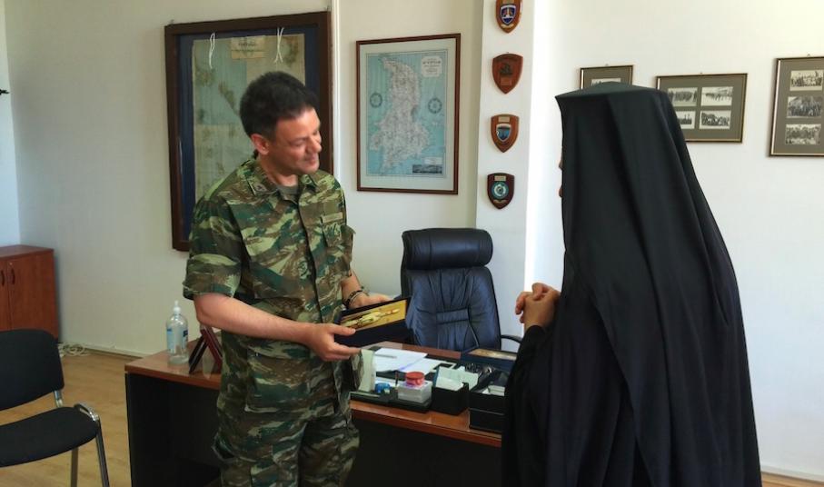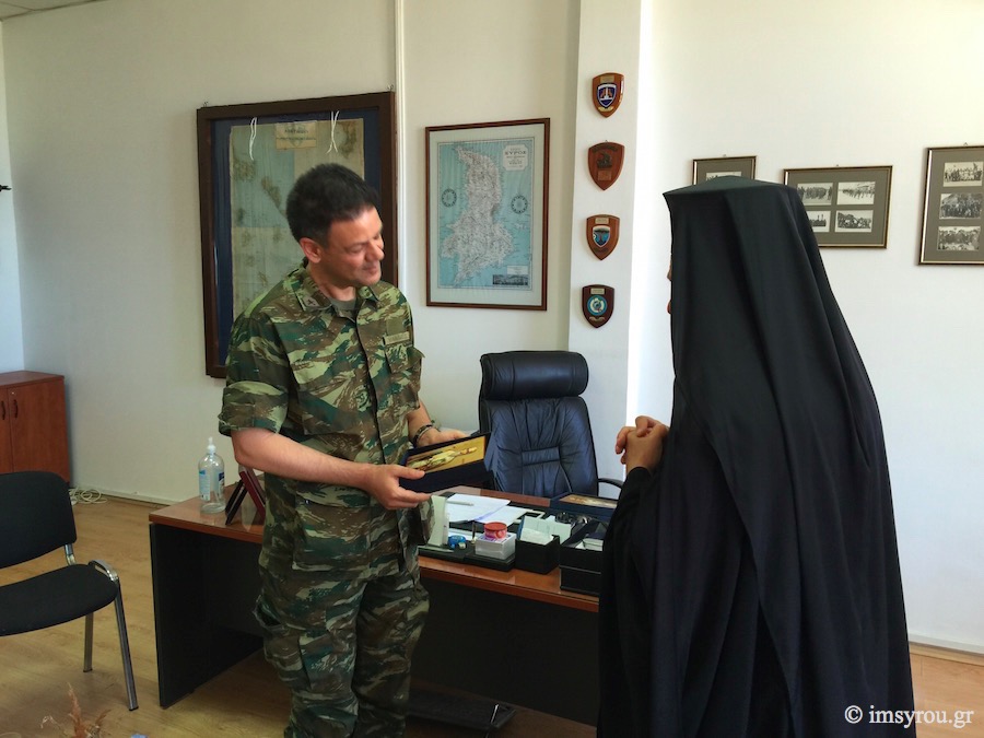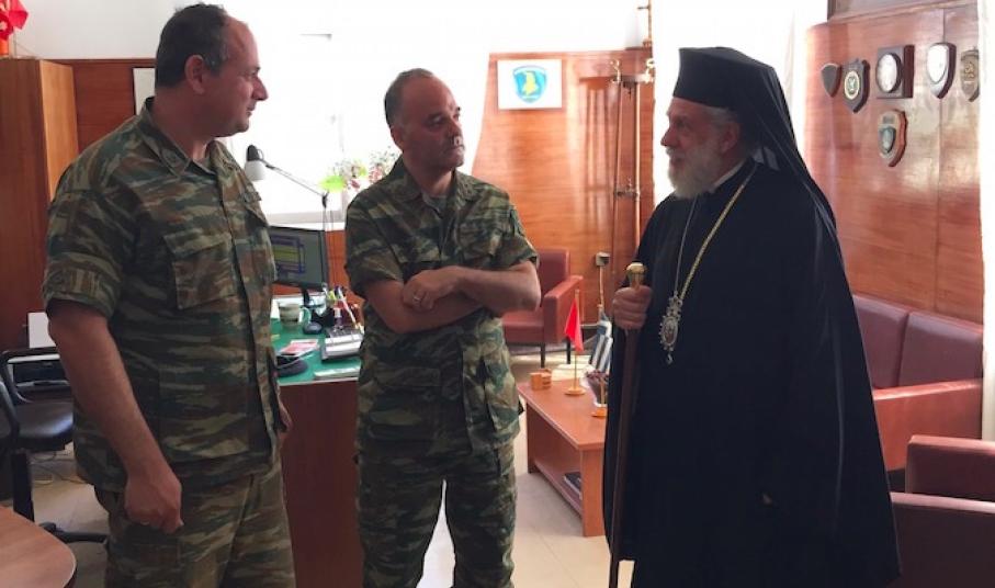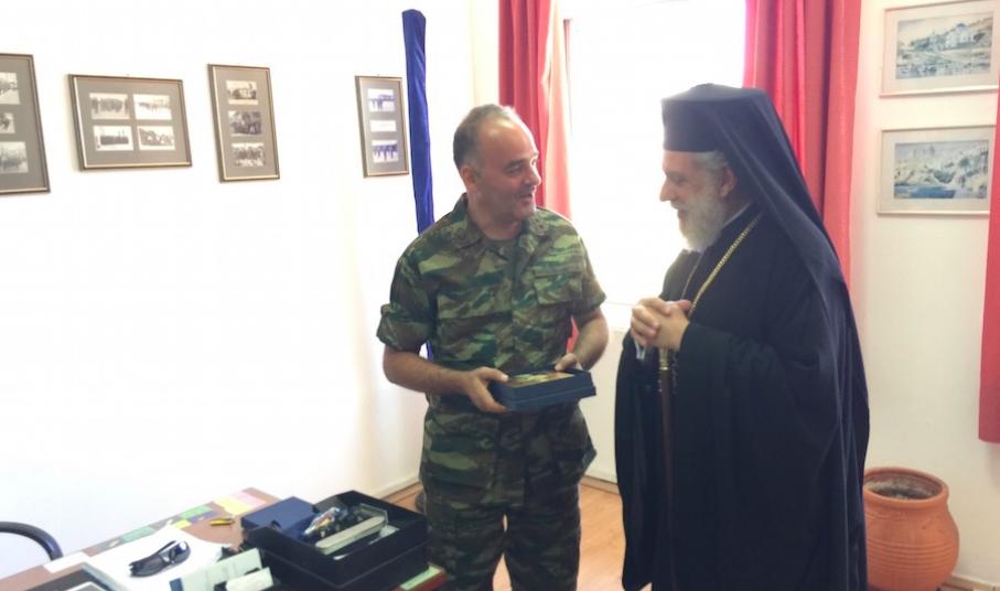Ακολούθως, μετέβη στο Τάγμα Εθνοφυλακής Ερμουπόλεως, όπου παρέστη στην τελετή αλλαγής της Διοικήσεώς του, ευχαρίστησε τον απελθόντα Διοικητή για την άριστη, επί διετία, συνεργασία του με την Εκκλησία, συνεχάρη δε τον νέο Διοικητή επί τη αναλήψει των καθηκόντων του και του ευχήθηκε πλήρη επιτυχία στην αποστολή του.