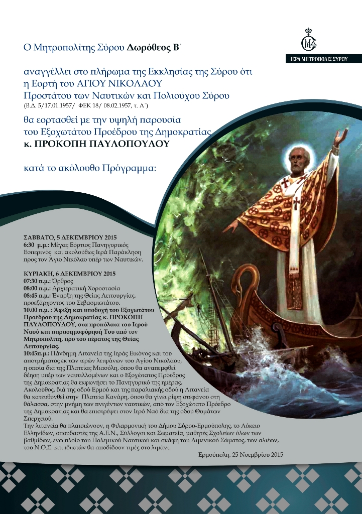 Την αφίσα με το πρόγραμμα των ιερατικών εκδηλώσεων, για την εορτή του Αγίου Νικολάου, προστάτη των ναυτικών και πολιούχου αγίου της Σύρου, εξέδωσε η Ιερά Μητρόπολη Σύρου.