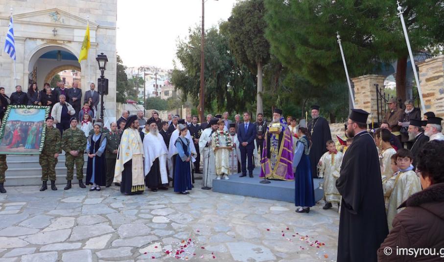 Στον αύλιο χώρο του Κοιμητηριακού Ιερού Ναού του Αγίου Γεωργίου Ερμουπόλεως, ο ιερός Κλήρος και ο Λαός της Σύρου, παρουσία του Δημάρχου ο Σεβασμιώτατοςκ. Δωρόθεος Β' διεκόμισε λείψανο του Αγίου Νεκταρίου, προερχόμενο από το παστοφόριο του Πανιέρου Ναού Ευαγγελιστρίας Τήνου.