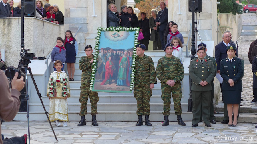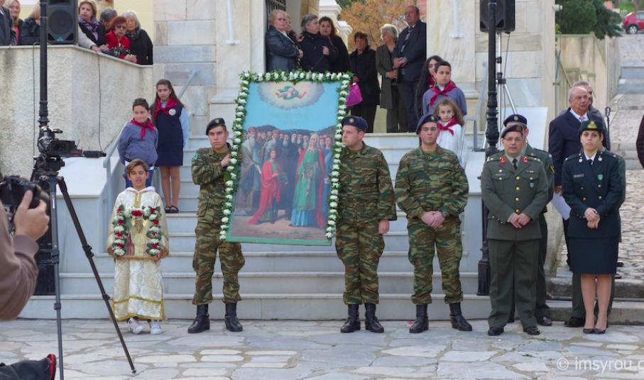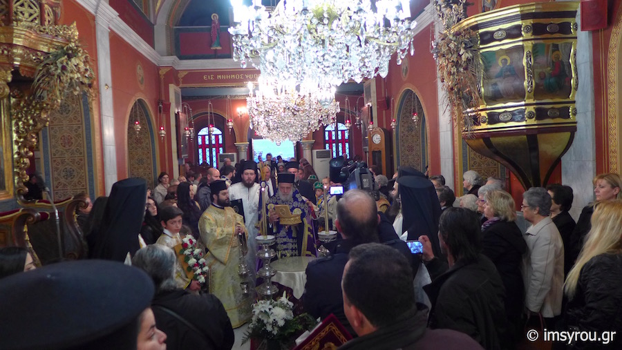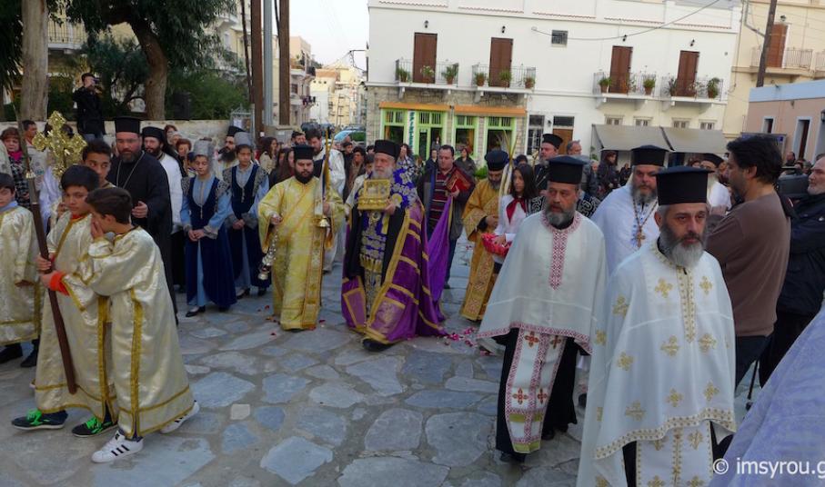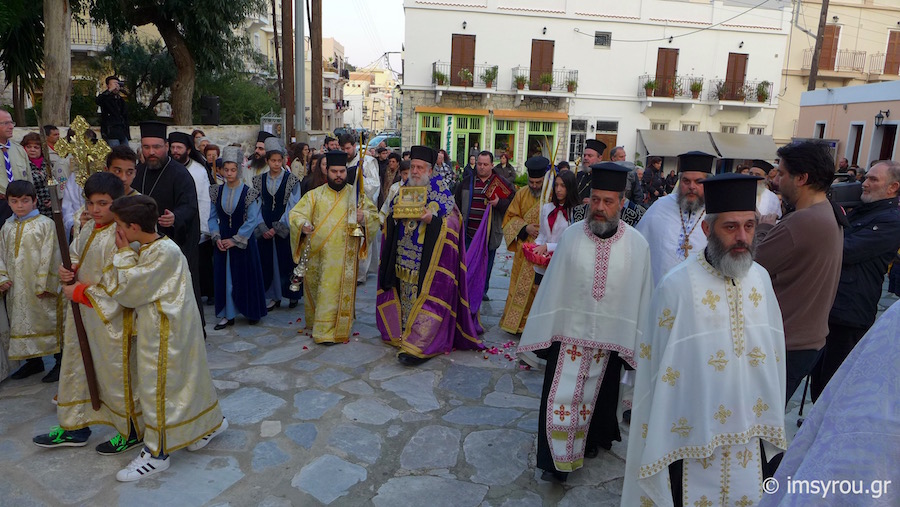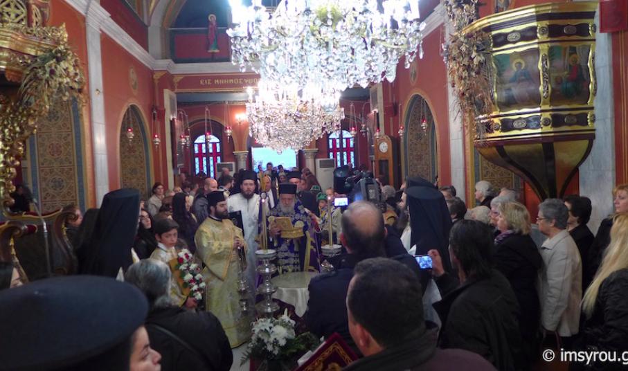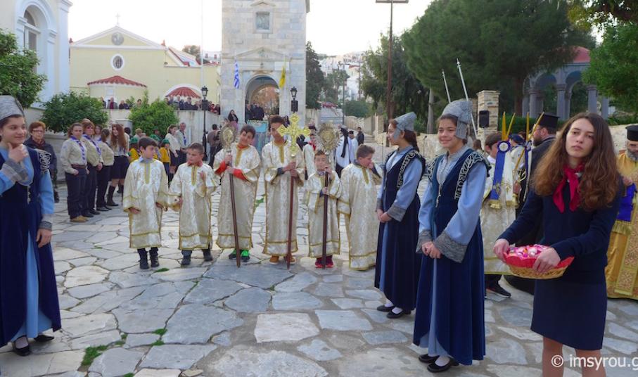 Το ιερό λείψανο τέθηκε προς προσκύνημα στον αύλειο χώρο του Κοιμητηριακού Ιερού Ναού, παρουσία του Δημάρχου Σύρου-Ερμούπολης κ. Γ. Μαραγκού, Αντιδημάρχων και Δημοτικών Συμβούλων, Αξιωματικών και ανδρών του Τάγματος Εθνοφυλακής, οι οποίοι έφεραν την εικόνα, που φυλάσσεται στον Ιερό Ναό Κοιμήσεως της Θεοτόκου Ερμούπολης και του Διοικητού της 6ης Περιφερειακής Διοίκησης του ΛΣ-ΕΛ.ΑΚΤ, κ. Χαράλαμπου Αϊβαλιώτη. Στον Διενοριακό Κατανυκτικό Εσπερινό παρευρέθηκαν επίσης ο Λιμενάρχης Σύρου Ιάκωβος Γκίζης, ο Διοικητής της Ακαδημίας Εμπορικού Ναυτικού Σύρου κ. Ιωάννης Πολέμης ,Νεανίδες του Λυκείου Ελληνίδων, Πρόσκοποι και Οδηγοί καθώς και μαθητές των Κατηχητικών Σχολείων Αγίου Νικολάου και Αγίου Γεωργίου με τους Κατηχητές και τις Κατηχήτριές τους.