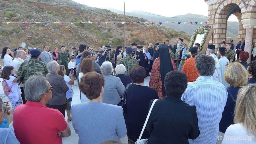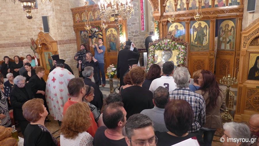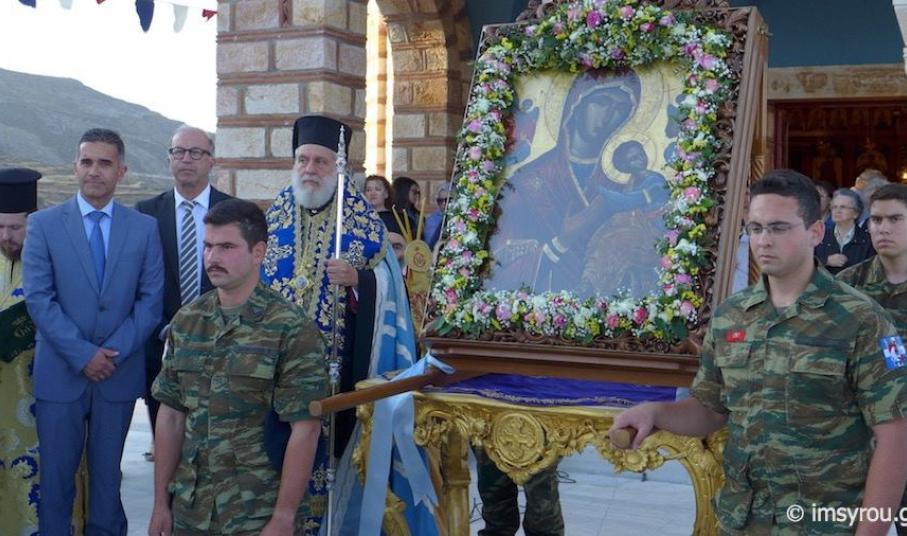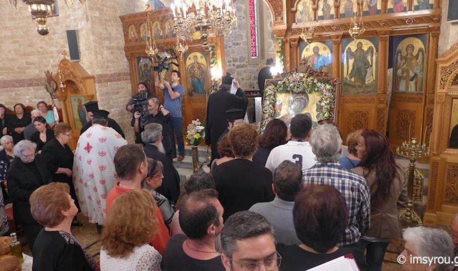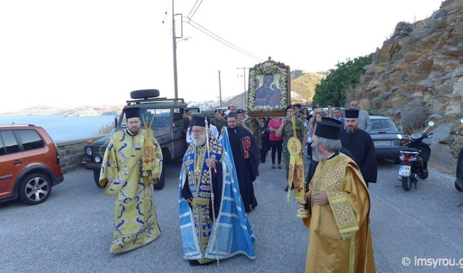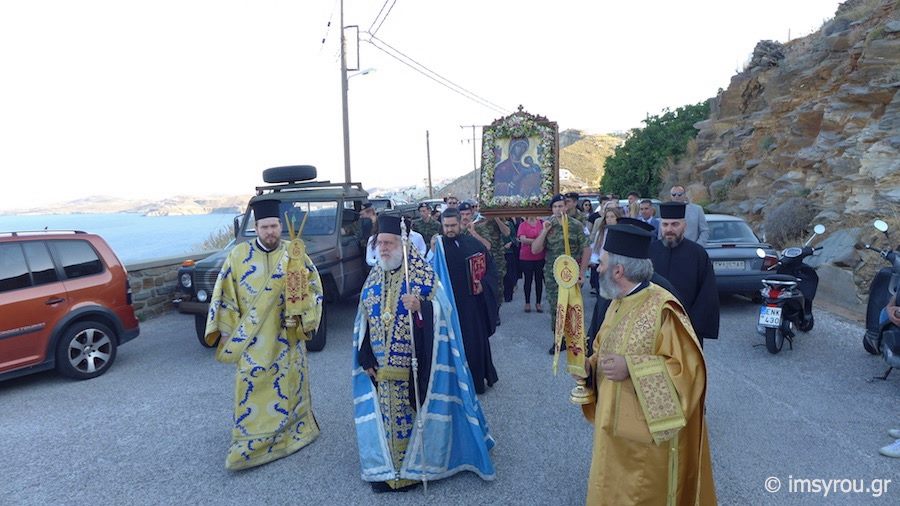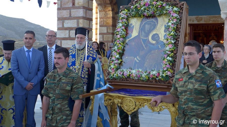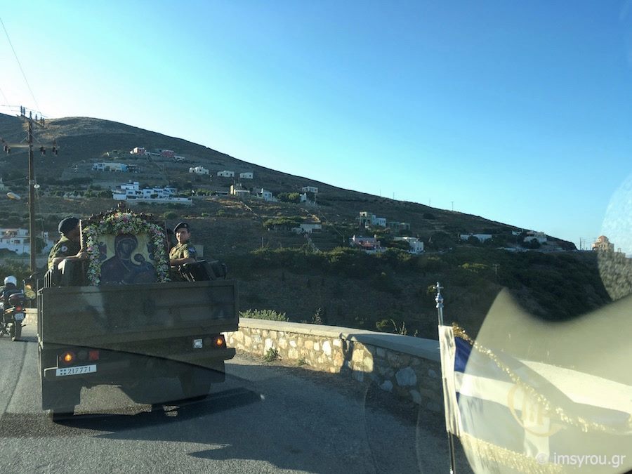 Πλήθος πιστών κι εκπρόσωποι της Τοπικής Αυτοδιοίκησης μετέβησαν στο Ναό παραμένοντας στον αύλιο χώρο όπου κι έγινε η υποδοχή της ιερής εικόνας, την οποία συνόδευσαν ο Σεβασμιώτατος Μητροπολίτης Σύρου, κ. Δωρόθεος Β΄, μέλη του κλήρου, ενώ πρέπει να τονισθεί πως, η μεταφορά της πραγματοποιήθηκε με στρατιωτικό όχημα.