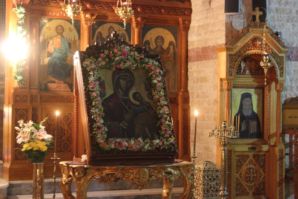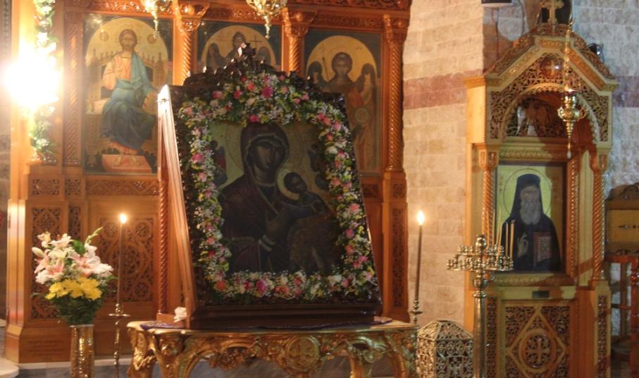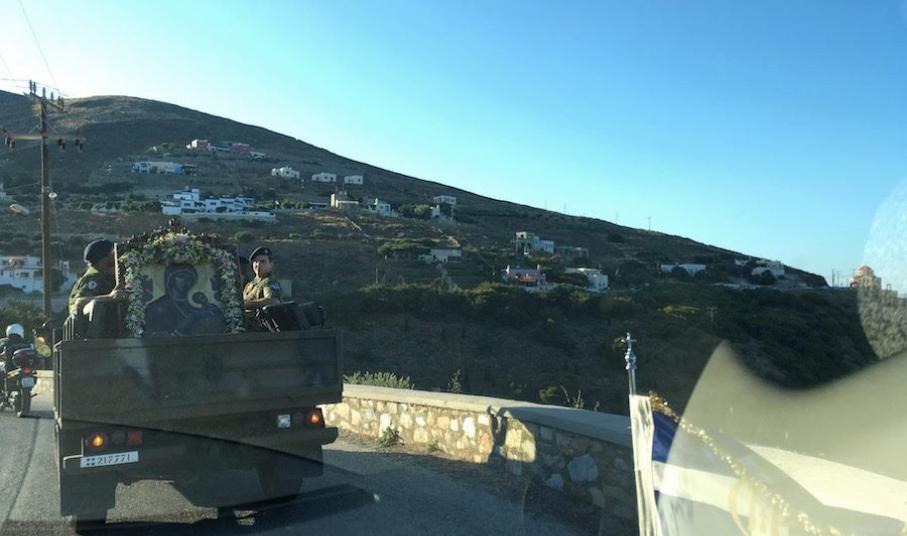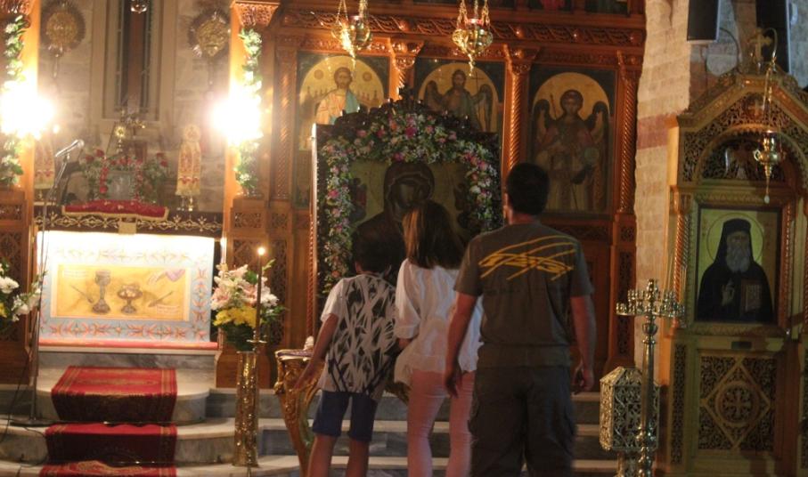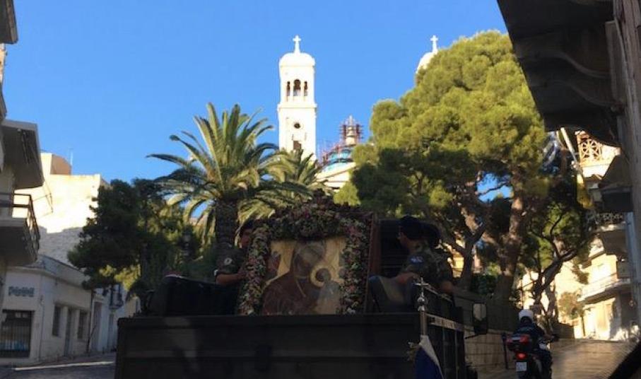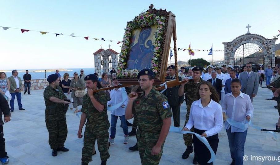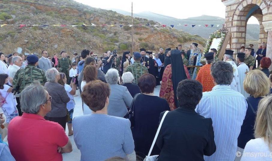 Πλήθος πιστών κι εκπρόσωποι της Τοπικής Αυτοδιοίκησης μετέβησαν στο Ναό παραμένοντας στον αύλιο χώρο όπου κι έγινε η υποδοχή της ιερής εικόνας, την οποία συνόδευσαν ο Σεβασμιώτατος Μητροπολίτης Σύρου, κ. Δωρόθεος Β΄, μέλη του κλήρου, ενώ πρέπει να τονισθεί πως, η μεταφορά της πραγματοποιήθηκε με στρατιωτικό όχημα.