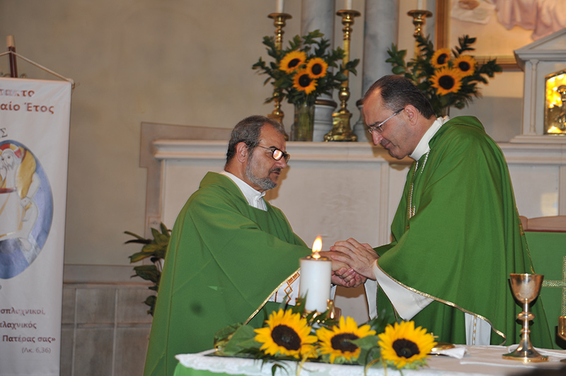Στην τελετή ανάληψης καθηκόντων του νέου Εφημερίου Αγίου Παντελεήμονα Φοίνικα π. Ιωάννη Μαραγκού από τον απερχόμενο Εφημέριο π. Πέτρο Πρίντεζη παρέστη την Κυριακή 10 Ιουλίου 2016 στον Ιερό Ναό του Αγίου Παντελεήμονα στο Φοίνικα ο Σεβασμιώτατος Επίσκοπος Σύρου και Αποστολικός Τοποτηρητής Θήρας-Κρήτης π. Πέτρος Στεφάνου.
