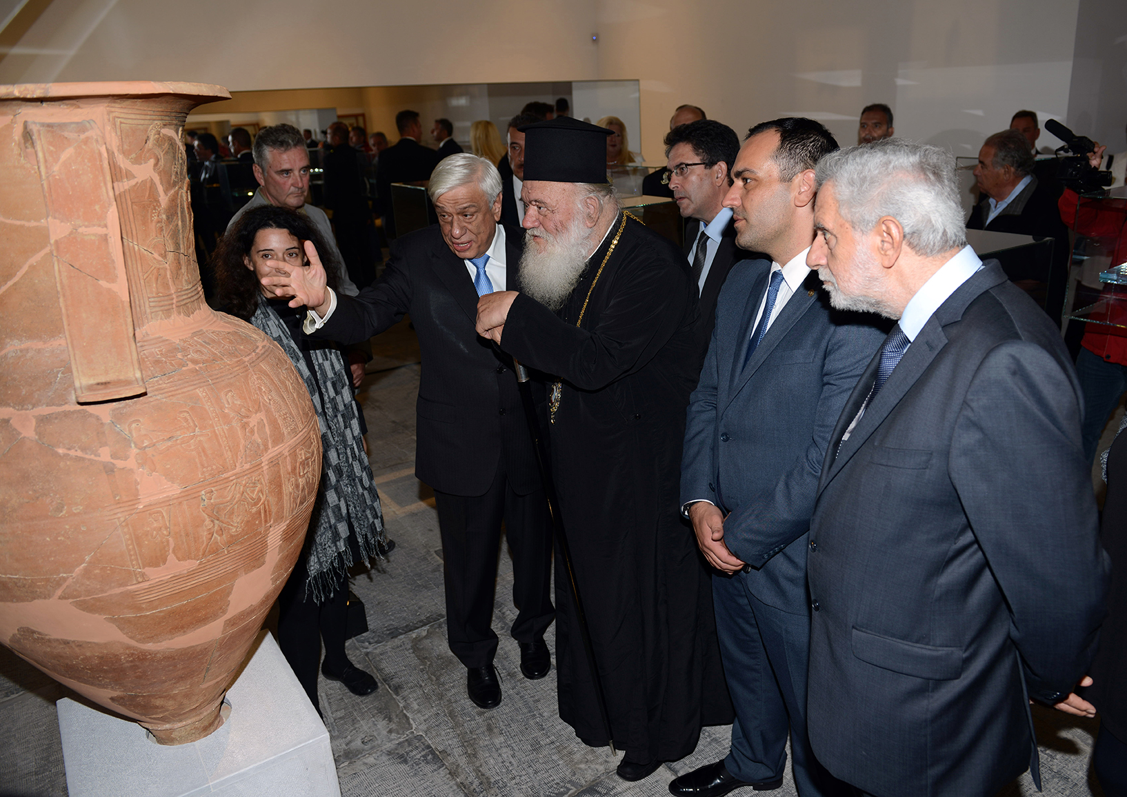 Μετά το πέρας της τελετής οι καλεσμένοι επισκέφτηκαν την πρωτοποριακή αρχαιολογική έκθεση "VANITY- Η ιστορία του κοσμήματος στις Κυκλάδες" στο Μουσείο της Μυκόνου και ξεναγήθηκαν από τον Προϊστάμενο της Εφορείας Αρχαιοτήτων Κυκλάδων κ. Δημήτρη Αθανασούλη και τους συνεργάτες του. Η έκθεση που αποτελεί μία συνδιοργάνωση της Εφορείας Αρχαιοτήτων Κυκλάδων και του Δήμου Μυκόνου και τελεί υπό την αιγίδα της Προεδρίας της Δημοκρατίας -όπως και άλλες ανάλογες πολιτιστικές εκδηλώσεις που πραγματοποιήθηκαν φέτος το καλοκαίρι στην Μύκονο- προκάλεσε τον ενθουσιασμό των υψηλών καλεσμένων μας για τη μοναδικότητά της στον ελληνικό χώρο.