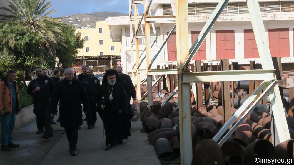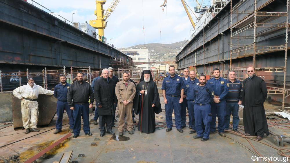 Στις εγκαταστάσεις των Ναυπηγείων του "ΝΕΩΡΙΟΥ" Σύρου μετέβη σήμερα ο Σεβασμιώτατος κ. Δωρόθεος Β' , συνοδευόμενος από τον Αρχιερατικό Επίτροπο Σύρου, Πρωτοπρ. Φαβιανό Αλμπέσκου, και τους Διακόνους του, κατόπιν προσκλήσεως των Αξιωματικών του Πολεμικού Ναυτικού, που εποπτεύουν την επισκευαζόμενη στο Ναυπηγείο Δεξαμενή του ΠΝ, γενόμενος δεκτός με εγκαρδιότητα από τον Διευθύνοντα Σύμβουλο της Επιχείρησης κ. Ιω. Στεφάνου, τον Διοικητή της Ομάδος των Αξιωματικών του ΠΝ κ. Χαντρομαντζίδη Γεώργιο, και τον Πρόεδρο των Εργαζομένων στα Ναυπηγεία κ. Μάνθο Ευάγγελο.