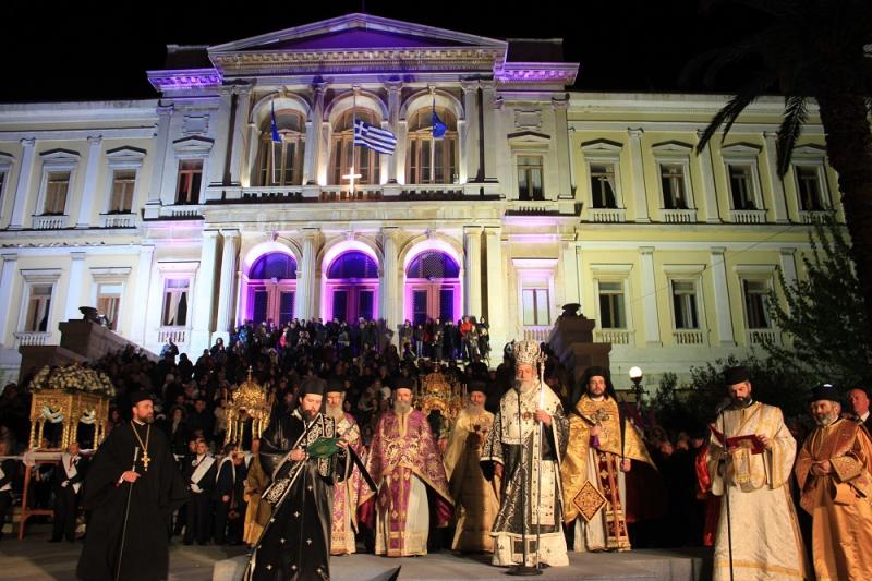 Η Λιτανεία του Επιταφίου από τον Ιερό Μητροπολιτικό Ναό, θα ακολουθήσει την εξής διαδρομή: Oμήρου, Ηπείρου, Στ. Πρωΐου, δια της οδού Χίου στην Ακτή Π. Ράλλη, Ελευθερίου Βενιζέλου, είσοδος στην Πλατεία Μιαούλη από την ανατολική πλευρά. Έξοδος από την πλατεία από τη δυτική πλευρά και επάνοδος στο Ναό, δια των οδών Χίου και Μητροπολίτου Αντωνίου Πολίτη.