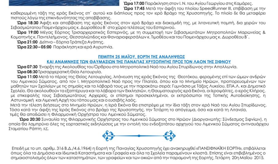 17:45 Μετά την άφιξη του πλοίου SpeedRunner III, επιβίβαση με την καθιερωμένη τάξη της ιεράς Εικόνος επ' αυτού και διάπλους προς τον ιερό Βράχο της Χρυσοπηγής. Το πλοίο δε θα μεταφέρει πιστούς λόγω της επικινδυνότητας της αποβίβασης.