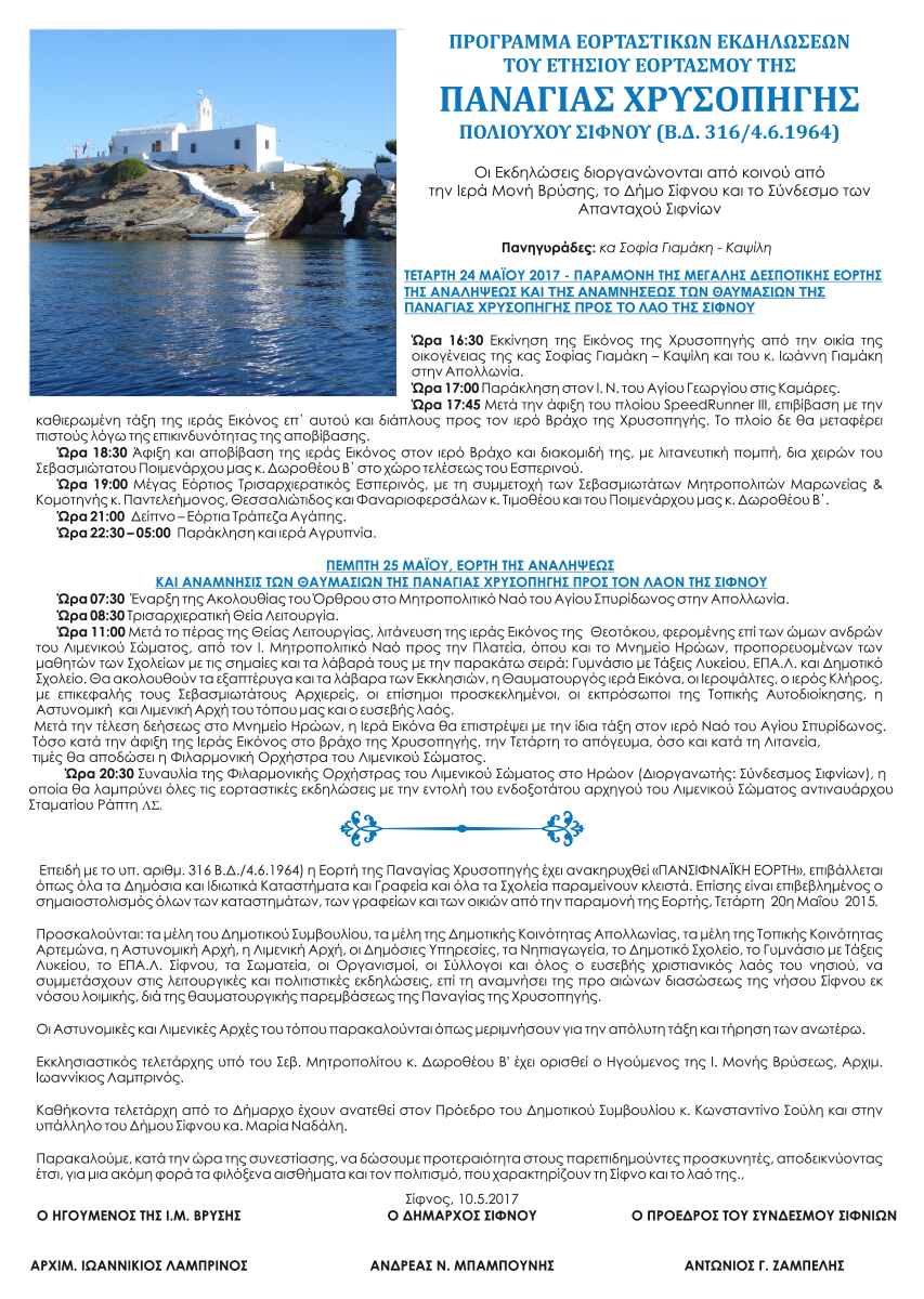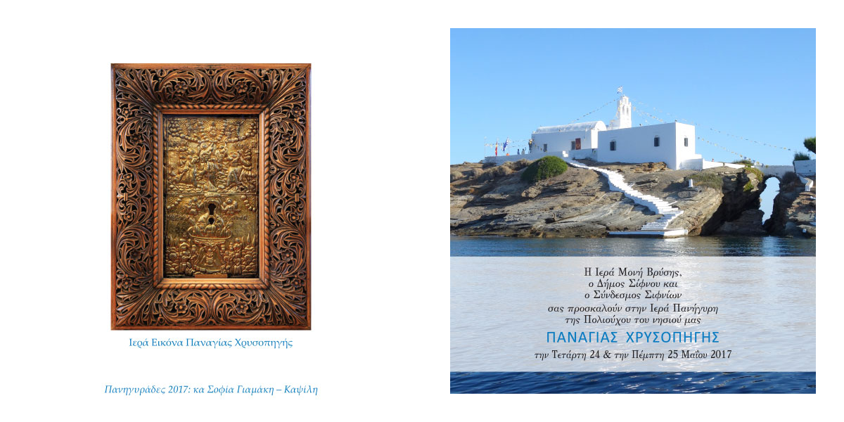 Η Ιερά Μονή Βρύσης, ο Δήμος Σίφνου και ο Σύνδεσμος Σιφνίων σας προσκαλούν στην Ιερά Πανήγυρη της Πολιούχου του νησιού Παναγίας Χρυσοπηγής την Τετάρτη 24 και την Πέμπτη 25 Μαΐου 2017.