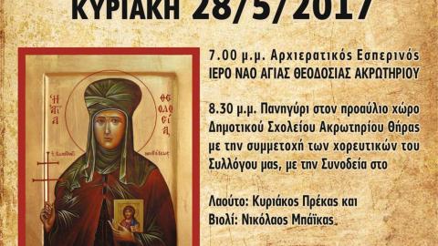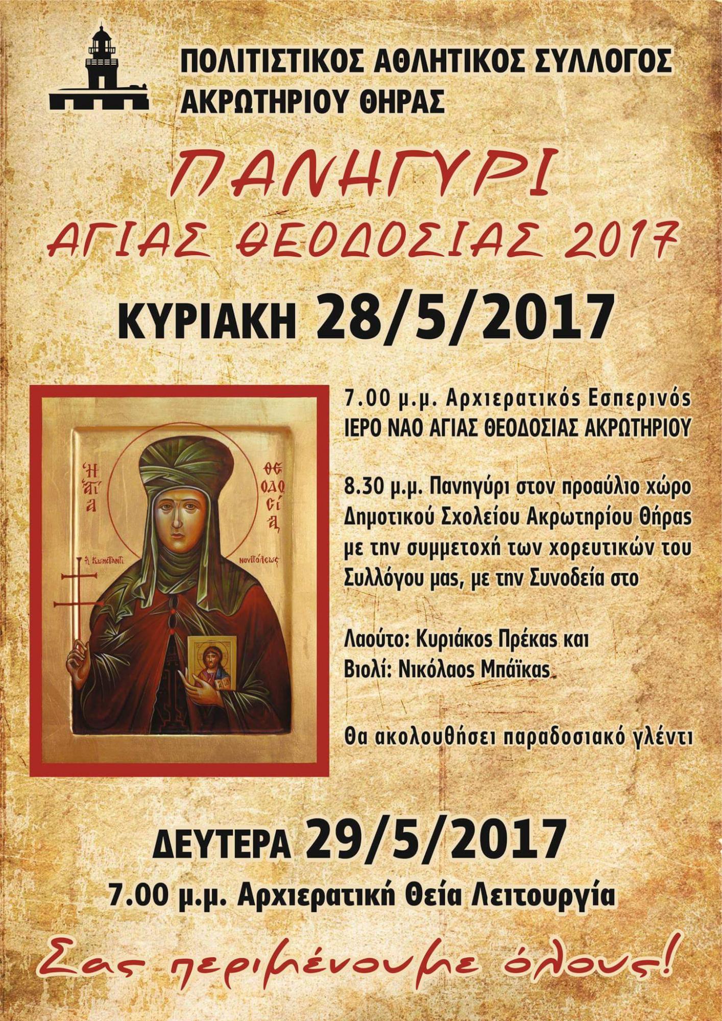 Ο Πολιτιστικός και Αθλητικός Σύλλογος Ακρωτηρίου Θήρας, διοργανώνει και προσκαλεί κάθε ενδιαφερόμενο, στο ετήσιο Πανηγύρι της Αγίας Θεοδοσίας 2017.