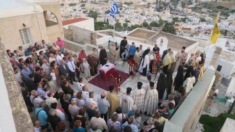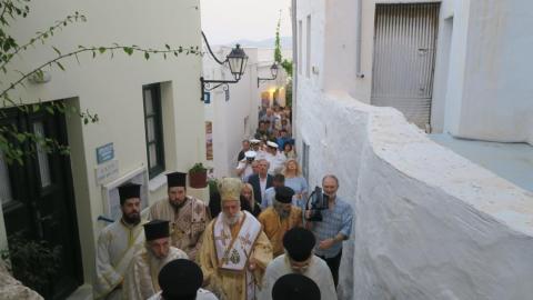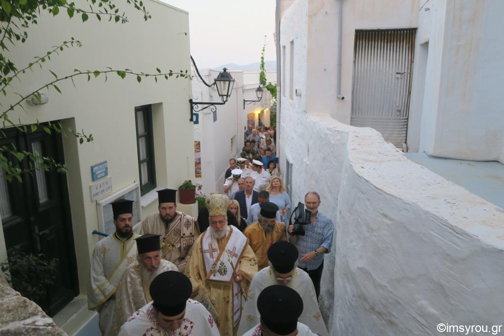 Στη συνέχεια, πραγματοποιήθηκε λιτάνευση των ιερών εικόνων της Αγίας Τριάδος και του Αγίου Δωροθέου στα γραφικά δρομάκια της Άνω Σύρου.