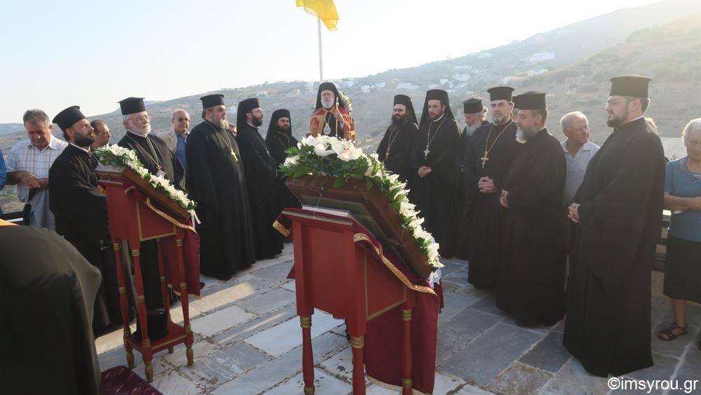 Στον ιστορικό Ιερό Ναό της Αγίας Τριάδος Άνω Σύρου τελέσθηκε απόψε Πανηγυρικός Εσπερινός επι τη εορτή της Παναγίας Τριάδος και τη ιερά μνήμη του Αγίου Ιερομάρτυρος Δωροθέου, Επισκόπου Τύρου, χοροστατούντος του Σεβασμιωτάτου κ. Δωροθέου Β΄, συμπαραστατουμένου από τον ιερό Κλήρο της Σύρου και Κληρικούς εξ άλλων περιοχών, με την παρουσία του Δημάρχου Σύρου-Ερμούπολης κ. Γ. Μαραγκού, των Αντιδημάρχων κας Θ. Μενδρινού και Αλέξ. Αθανασίου και Δημοτικών Συμβούλων, του Περιφερειακού Συμβούλου κ. Μ. Δαδάου, του Διοικητού της 6ης Περιφέρειας του Λιμενικού Σώματος, του Λιμενάρχη Σύρου, του Διοικητή της Ακαδημίας Εμπορικού Ναυτικού Σύρου και πλήθους πιστών Συρίων και παρεπιδημούντων προσκυνητών.