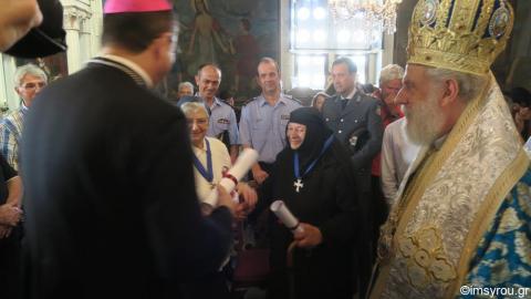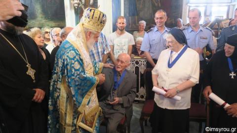 Ο Σεβασμιώτατος κ. Δωρόθεος Β' ευχαρίστησε τους παρισταμένους και τίμησε,μέσα σε μια συγκινησιακά φορτισμένη ατμόσφαιρα, με το μετάλλιο της Ιεράς Μητροπόλεως τρείς αφανείς, όπως είπε, "πρωταθλητές της ζωής", στους οποίους αξίζει οφειλόμενο έπαθλο και ευγνωμοσύνη,την Προηγουμένη της Ιεράς Μονής Αγίας Βαρβάρας,Μοναχή Αγνή Κοτσολάκη, την Αδελφή του Τάγματος της Παναγίας της Ελπίδος της ΡΚαθολικής εκκλησίας Λουίζα Παλαιολόγου και τον αιωνόβιο κ.Λεονάρδο Ρούσσο ή "Λιλή", ο οποίος αποτελεί εμβληματική μορφή της Άνω Σύρου, με πολύμορφη κοινωνική προσφορά και ανάδειξη ιδιαιτέρων πτυχών της πολιτιστικής ζωής του νησιού.