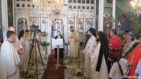 Ο Σεβασμιώτατος κ. Δωρόθεος Β' αναφέρθηκε στη ζωή και την προσφορά ενός εκάστου των τιμηθέντων και, επειδή σήμερα πραγματοποιούνται στη Σύρο οι αθλητικοί αγώνες " TRIMORE Syros Triathlon 2017" , τόνισε ότι "σήμερα το πρωί πολλοί συμπατριώτες μας τρέχουν στους δρόμους του νησιού, συμμετέχοντες στους αγώνες, και πολλοί απ` αυτούς θα έλθουν πρώτοι, εμείς εδώ, ιερουργήσαντες στην Ιερά αυτή και Σεβασμία Μονή,τιμάμε τρεις πρωταθλητές της ζωής, που ο χρόνος και η σωματική αδυναμία δεν τους επιτρέπουν να τρέχουν,όμως οι δεκάδες των ετών,που φέρουν στους ώμους τους έχουν αποταμιεύσει στο θησαυροφυλάκιο της ψυχής τους πολλούς καρπούς, πολλή προσφορά προς τον άνθρωπο,τον γέροντα, το νέο... Και τώρα ήλθε η ώρα να τους αποδώσουμε τον κότινο εκ μέρους της τοπικής μας κοινωνίας".