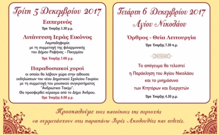 Ο Δήμος Άνδρου και το Εκκλησιαστικό Συμβούλιο του Ιερού Ναού Αγίου Νικολάου γνωστοποιούν το εορταστικό πρόγραμμα πανηγύρεως του Αγίου Νικολάου Γαυρίου, που αφορά τις ημέρες Τρίτη και Τετάρτη, 5 και 6 Δεκεμβρίου 2017, αντίστοιχα.
